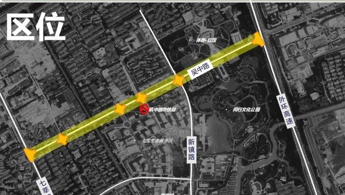吴中路作为自东北边进入七宝镇的第一条入镇道路,东起外环高速路,西至七莘路,全长约1.86公里,双向6车道,是打造七宝形象“国道”样板路。