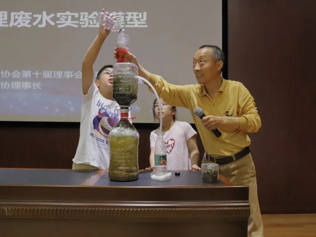 一杯浑浊的液体倒入装置入口,经过装置中微生物的各种处理后,变得清澈透明。小朋友们在赞叹它的神奇之处的同时,也体会到了节约用水,保护水资源的重要意义。