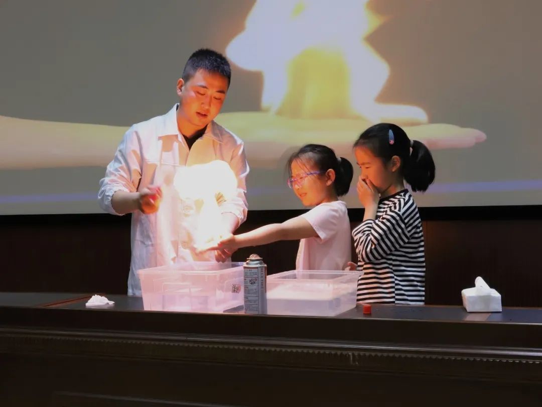 表演老师取出液体容器中的泡泡,倒在小朋友的手上,点火,神奇的现象就出现了,手掌中握着一团火焰,但手却毫发无伤。孩子们排队上台依次体验“掌心着火”的感觉,有的小朋友心中害怕,体验后脸上露出成功的喜悦。
