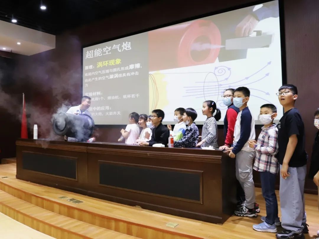 表演老师用大炮发射空气,“烟雾缭绕”中,纸杯瞬间被炸飞,小朋友们聚集在展示区周围,瞪大了眼睛,惊叹地看着纸杯在空气炮的强风中被击倒。大家迫不及待地想要上来尝试,同时也不忘互相比拼,看看谁击倒纸杯的数量最多。