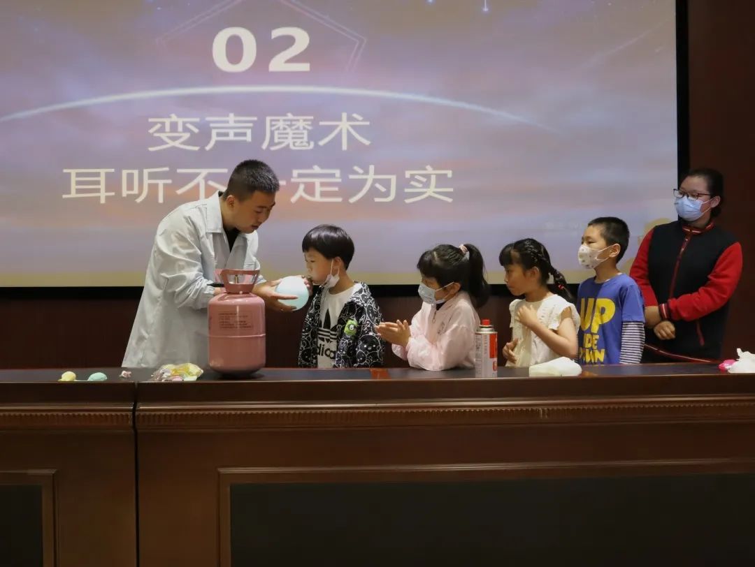 表演老师先是正常和小朋友们说话交流,随后吸入一口“变声气体”,再次开口发声时,说话的音色和音调则像换了一个人似的。孩子们也是踊跃上台,体验着“变声”的神奇。