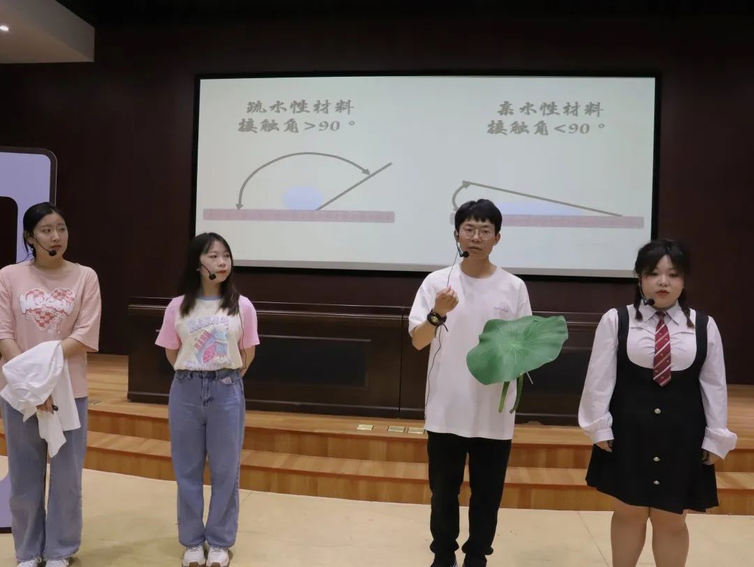 上海应用技术大学李文珏团队的四位同学带来了一件不会脏的衣服,表演者将果汁饮料等泼洒在衣物上,液体直接从衣服上滑落,而衣服依旧洁净如初,如同荷花般“出淤泥而不染,濯清涟而不妖”。