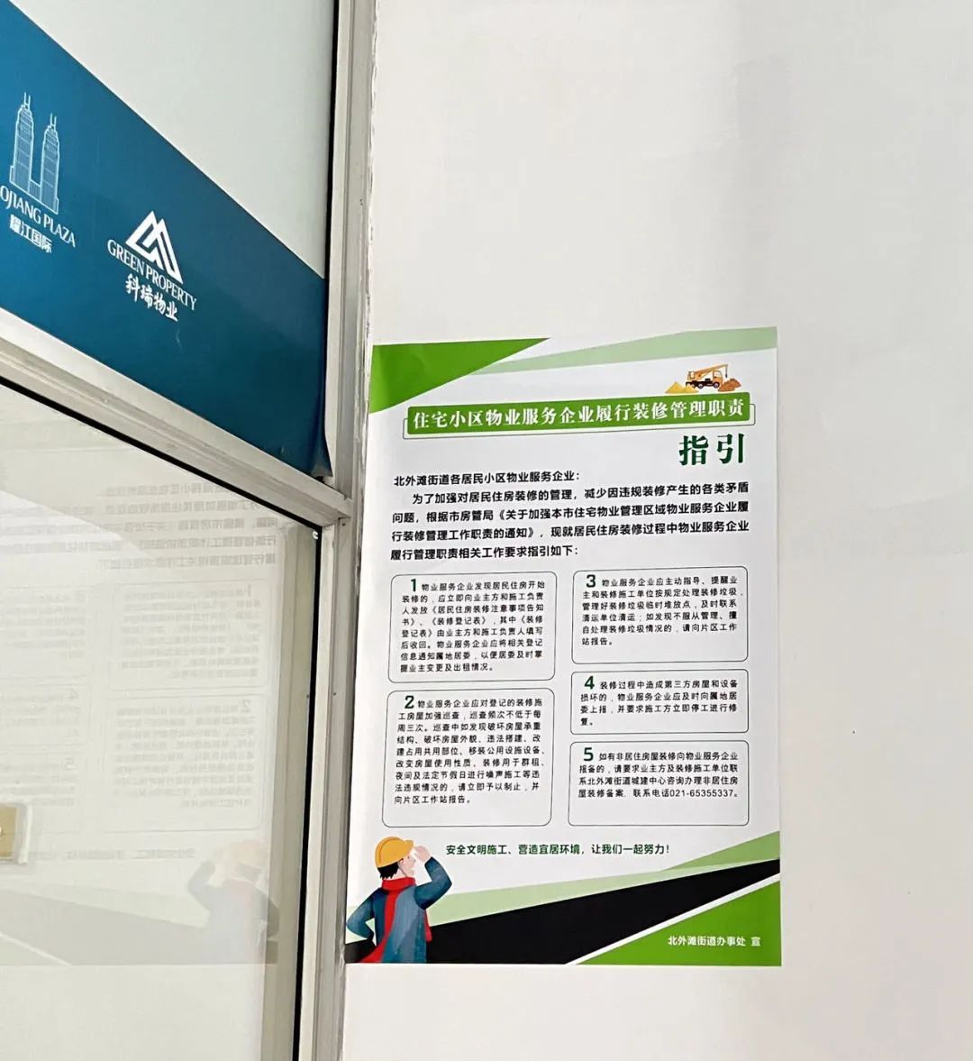 《住宅小区物业服务企业履行装修管理职责指引》宣传海报在北外滩街道各居民小区物业办公室统一张贴。
