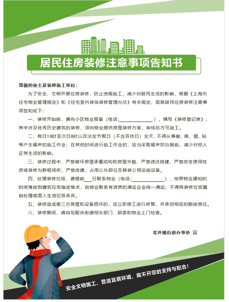 于是,北外滩街道专题研究部署,在西片区“解剖麻雀”,片区工作站会同街道城建中心对居民住房装修中的突出问题进行大调研,结合辖区实际,开展了“居民住房装修一件事”管理,编印了辖区《居民住房装修注意事项告知书》和《住宅小区物业服务企业履行装修管理职责指引》,今年5月起在北外滩街道住宅小区中全面推广实施。