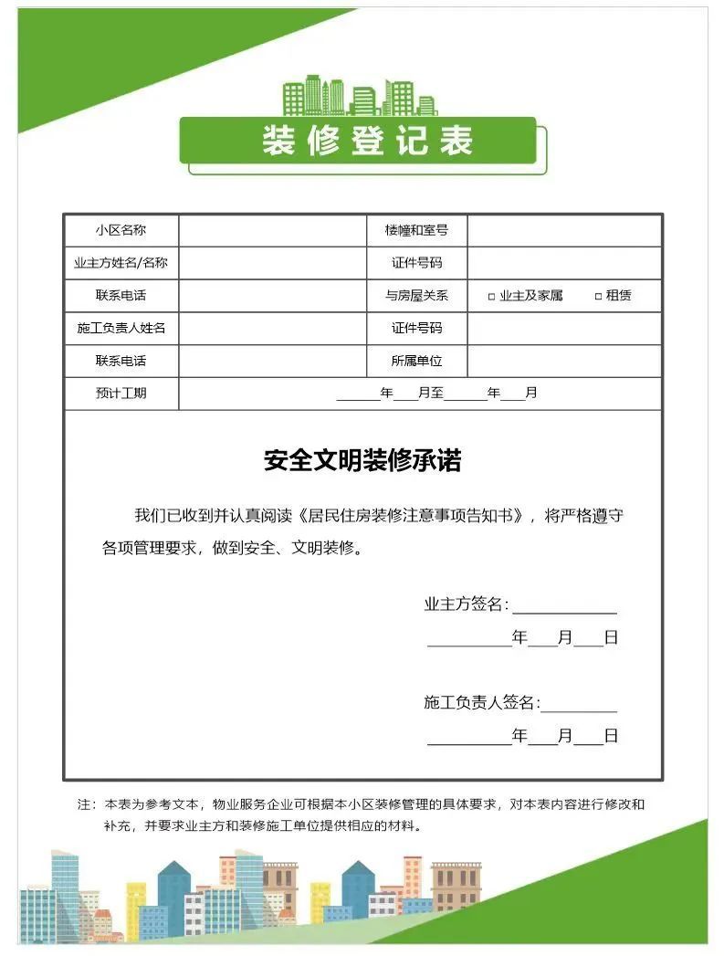此外,《居民住房装修注意事项告知书》聚焦居民住房装修过程中需要注意的如噪声作业时间、违法装修行为、建筑垃圾清运等六方面问题进行重点提示。《告知书》和配套的《装修登记表》由小区物业发放给每一户新装修居民。