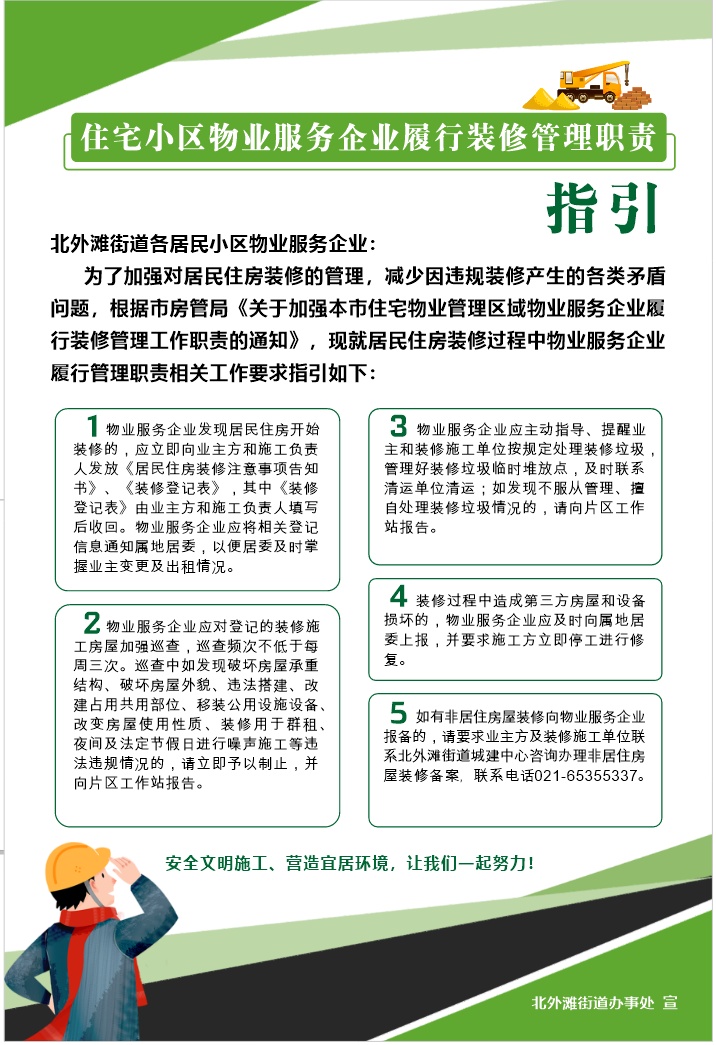 新编印的《住宅小区物业服务企业履行装修管理职责指引》,要求物业服务企业全面落实装修登记、装修房屋日常巡查、违规施工处置上报、建筑垃圾清运对接等管理职责,明确了巡查频率以及发现违规施工制止纠正并上报片区工作站处置的实操流程,确保物业企业对居民住宅装修管理职责落实到位,违规问题的发现和整改形成闭环。