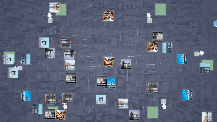 该区域设有墙面和桌面多媒体查询设备,以城市规划领域前沿专题为视角,展示不同城市关于城市发展的新实践;技术上实现多点触控,同时定制案例互动程序,有效支持图片的缩放和移动。