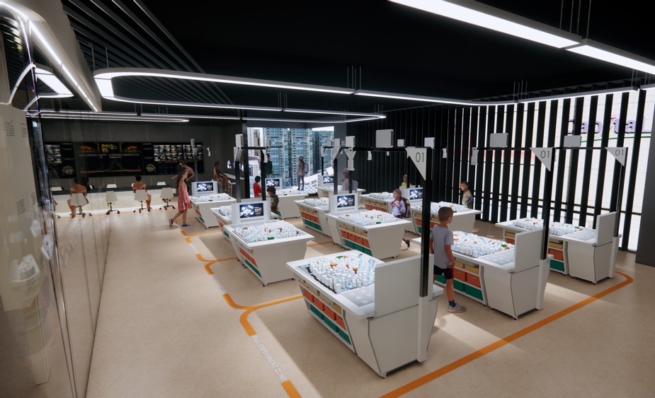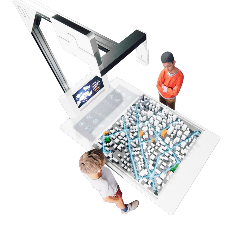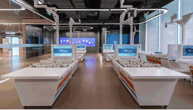 实验操作区是专为青少年打造的数字化规划实验区,青少年通过“角色扮演”的方式参与了解城市规划项目的全过程。定制开发的互动实验桌通过智能识别技术,并结合真实的地理信息数据为参与者营造出沉浸式的实验空间。每张实验桌都配有感应识别系统,通过快速扫描识别模拟沙盘并智能分析,实时反馈规划设计成果和规划指标数据,直观明了。