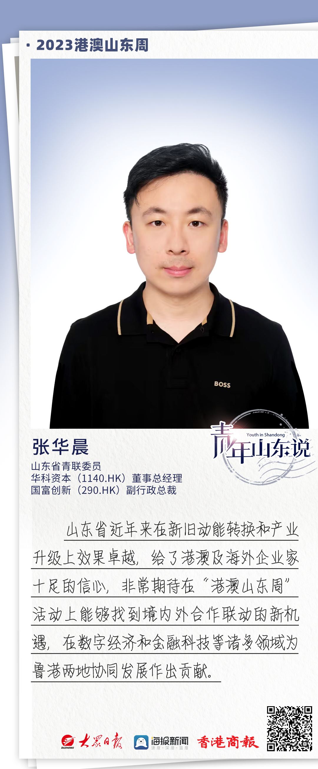 今天的青年受访者是山东省青联委员、华科资本(1140.HK)董事总经理、国富创新(290.HK)副行政总裁张华晨。华科资本是一家在香港联交所主板上市的跨境跨界投资公司,投资组合涵盖多个领域的上市及非上市公司,具有极强的投融资和行业整合能力。