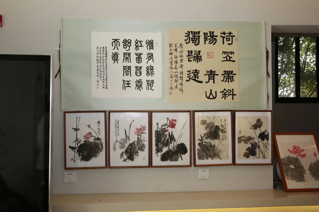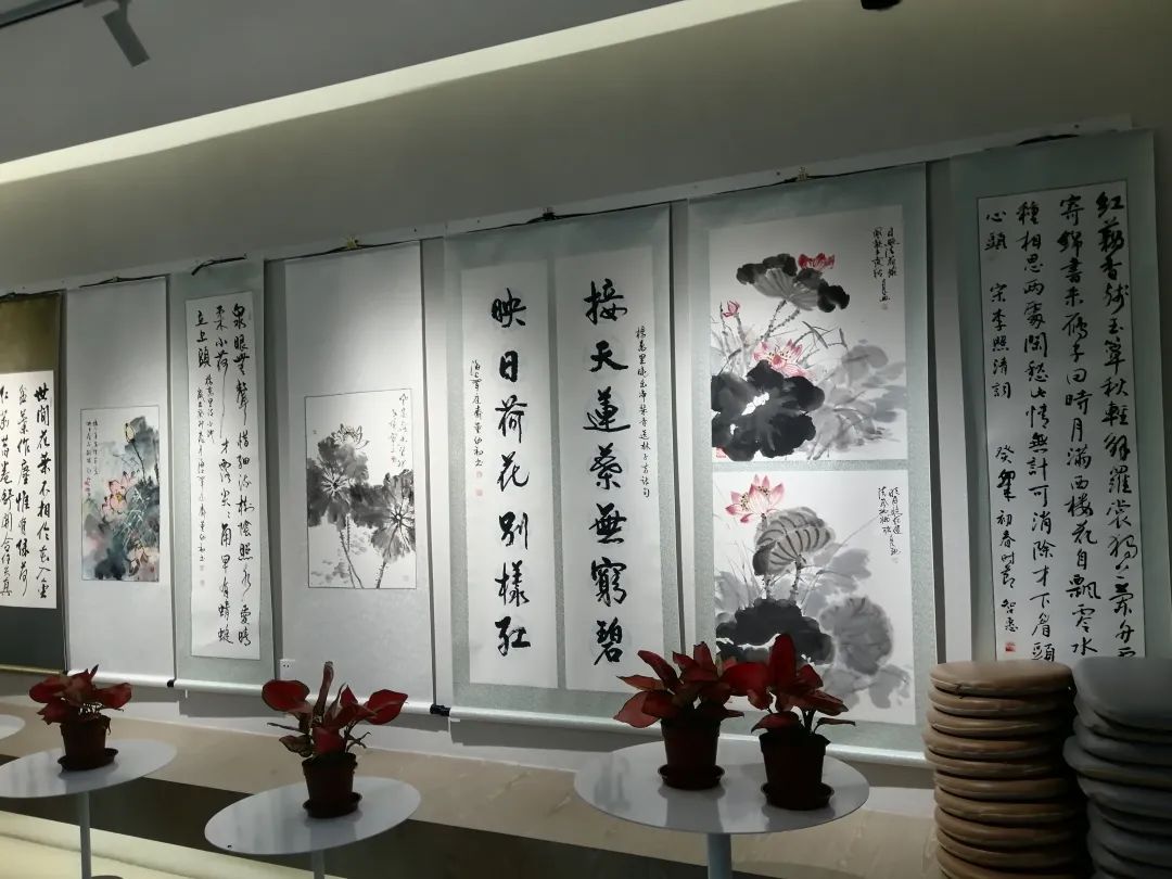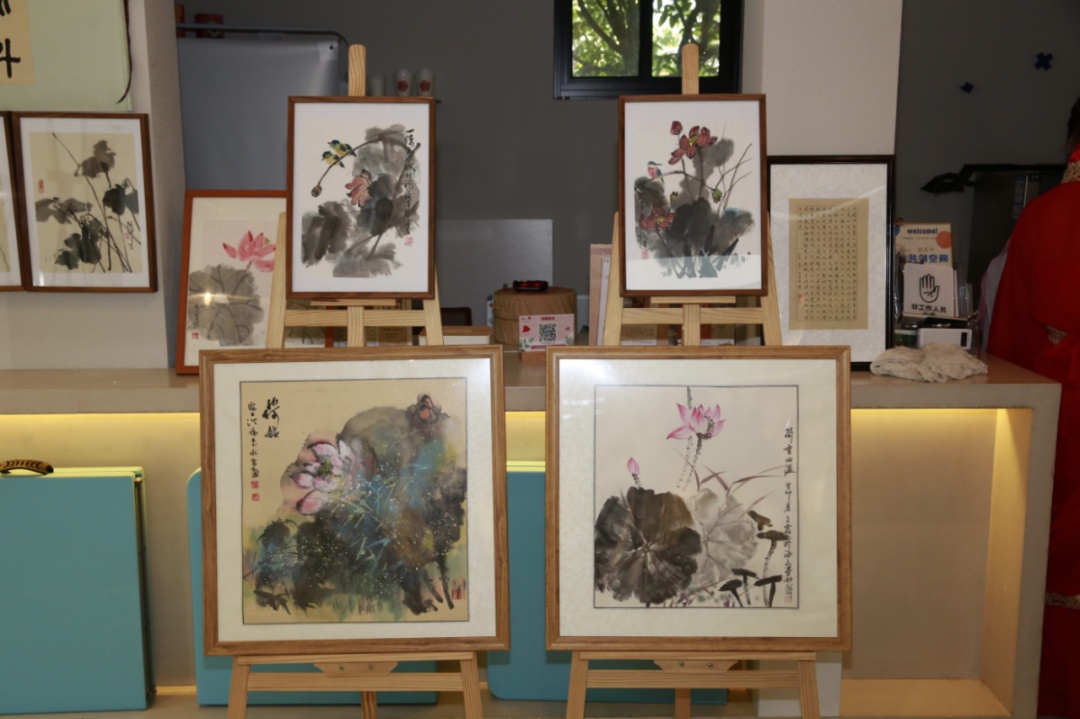 《荷花》主题公益书画展在静益坊同步举行,展出的书画作品由30位沪尚墨缘的公益书画家创作而成。