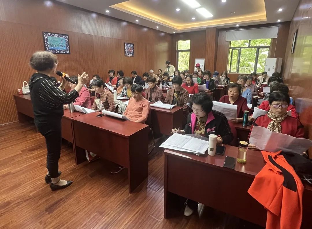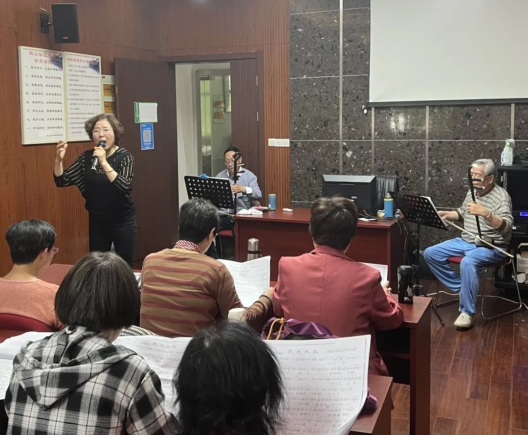 听到老人对上课氛围的称赞,枫泾镇社区老年学校戏曲班老师顾雪英也分享了自己的教学技巧,“学戏曲最重要的是开口唱,老师一个劲儿地唱是没用的,要学生会唱才行。一开始我让他们集体一起唱,然后三四个一组唱,最后每个人上台唱。有的老人不自信,不敢上台,我就告诉他们一个诀窍:先挺胸抬头,从外在姿势提高自信,鼓起精气神,大家就都敢上台大胆唱出来了”。