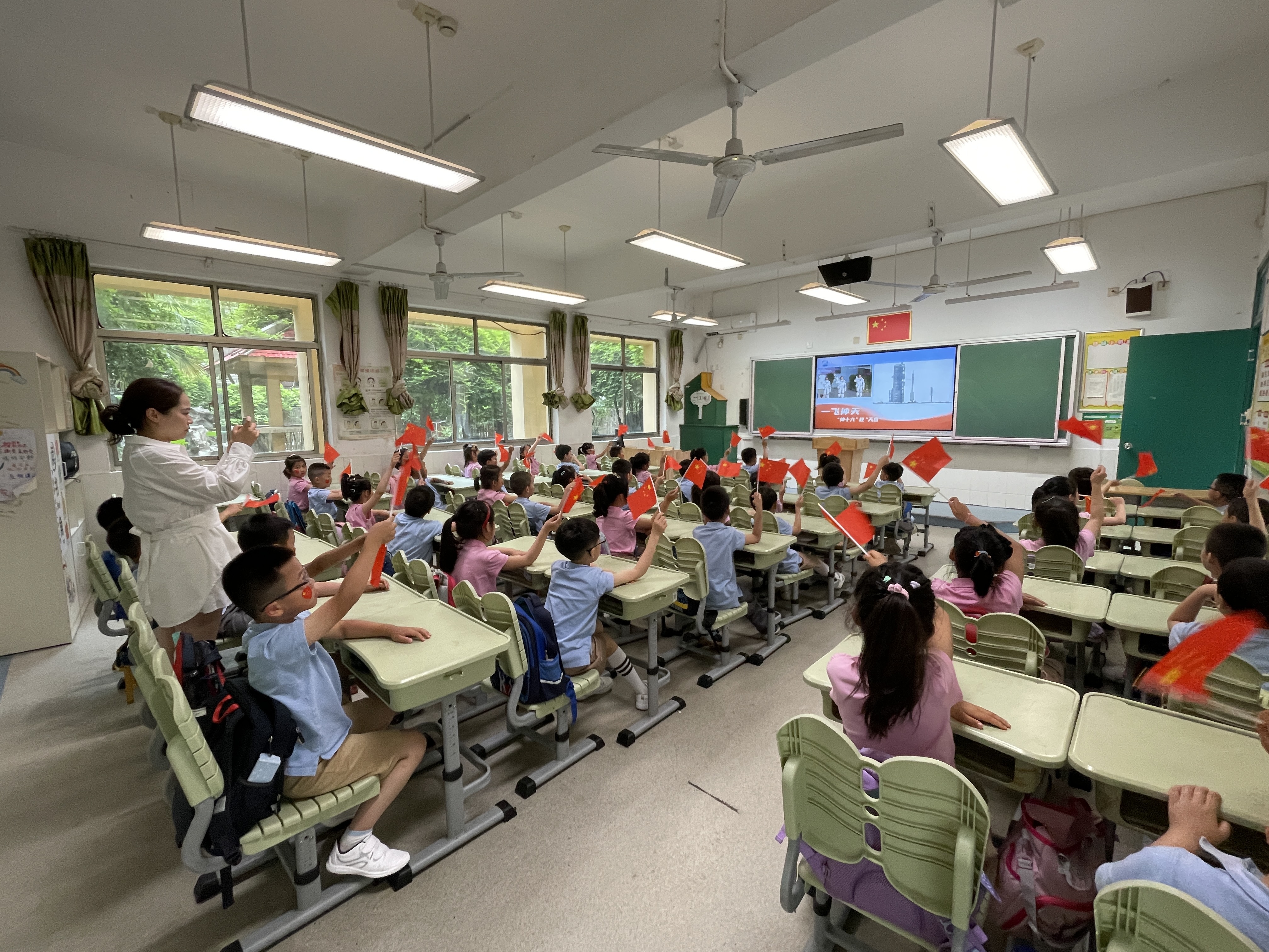 5月30日上午9点,凤凰花园城小学一(3)班的孩子们正襟危坐观看直播,手里攥着小红旗,脸上也贴了五星红旗,一起等待神舟十六号载人飞船发射。