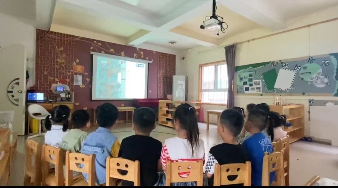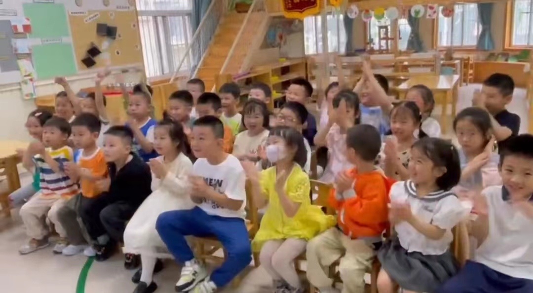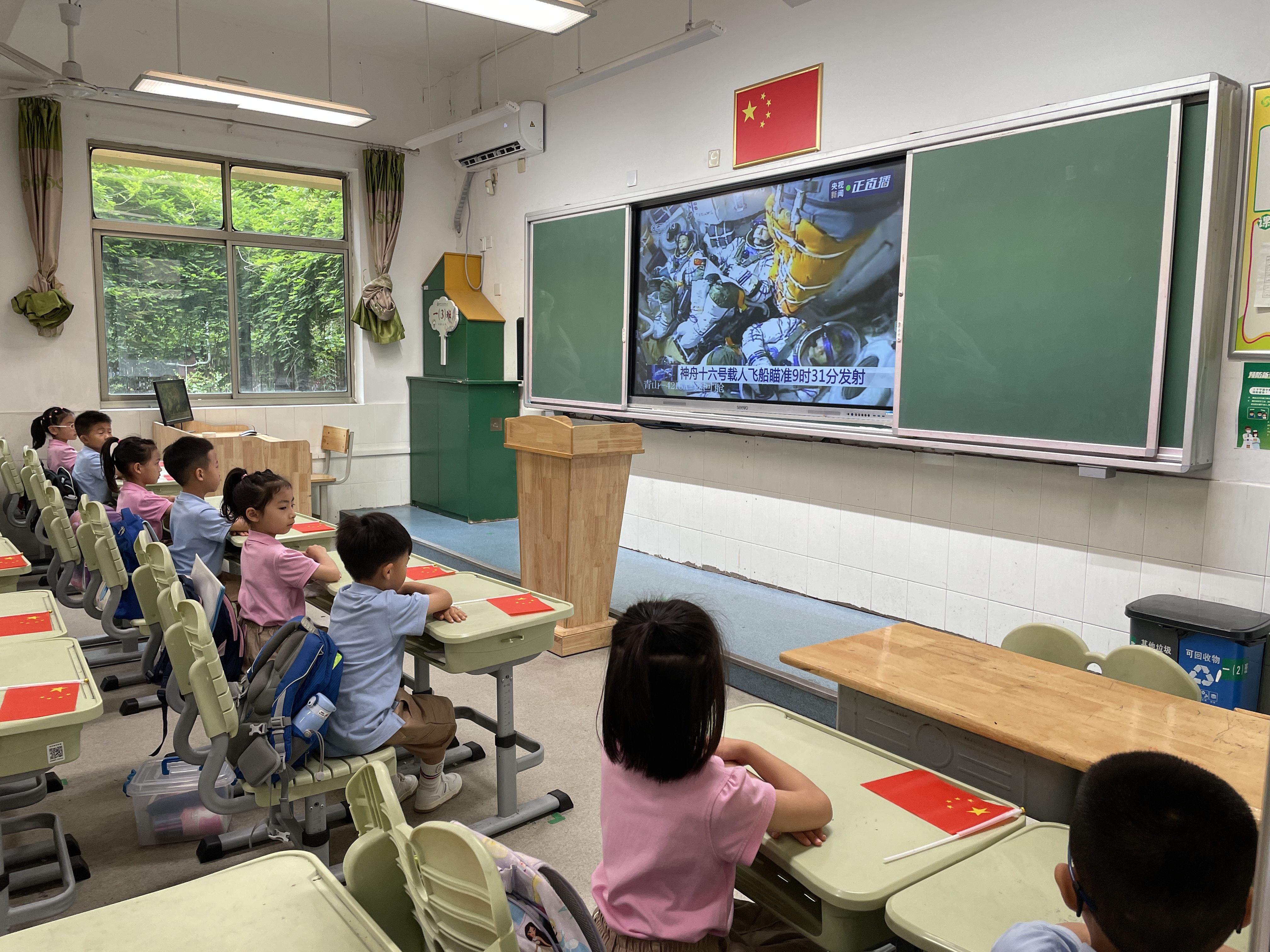 5月30日上午,南京天坛新寓幼儿园的孩子们早早来到幼儿园,在教室内坐好等着观看神舟十六号载人飞船发射直播。