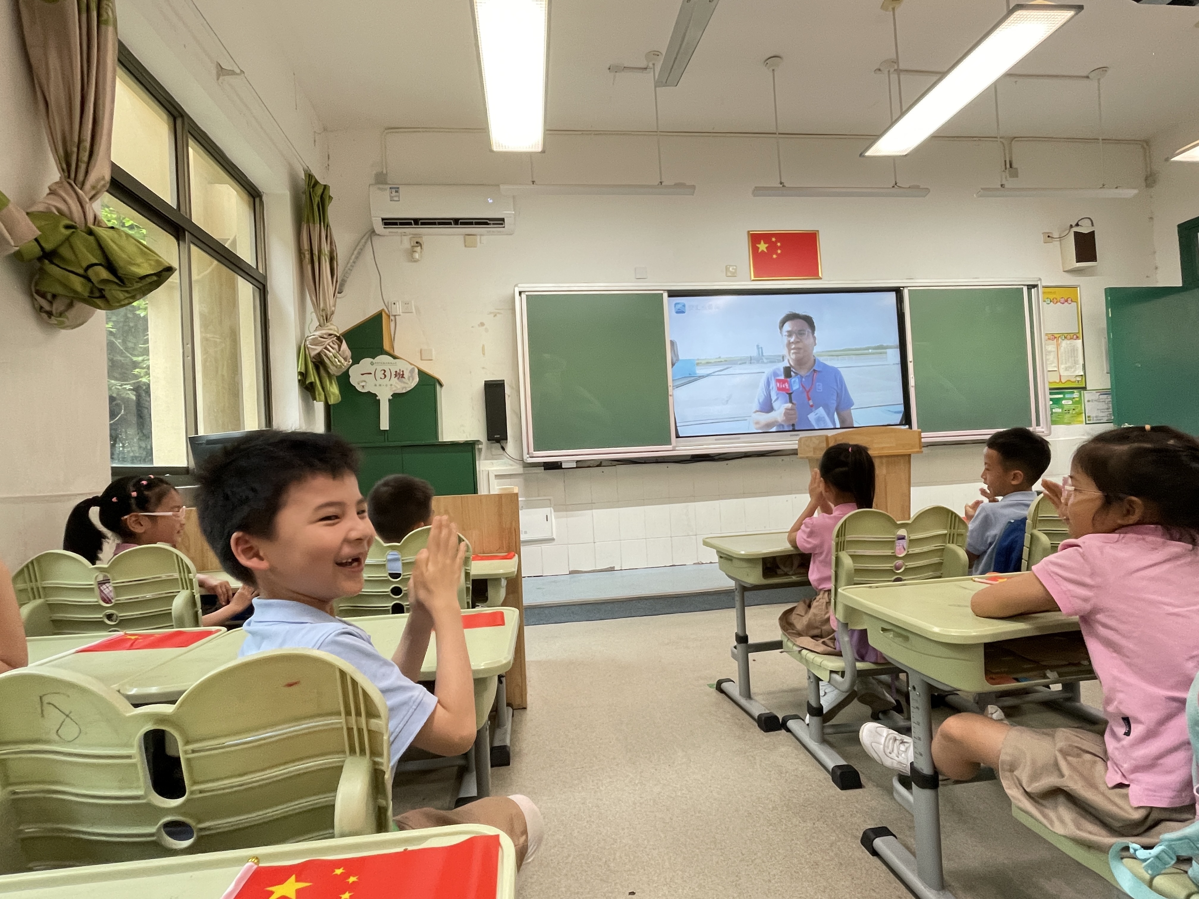 “大家好,我是新华日报交汇点记者……”当大屏幕上出现了新华日报记者的直播画面,班级里突然热闹起来,“你爸爸在那!”原来,班级里张小宣的爸爸作为记者正在酒泉卫星发射中心现场采访。张小宣害羞地捂住脸,又深吸几口气露出了骄傲的笑容。“我曾经和爸爸妈妈一起到过文昌看火箭发射,这次看到神舟十六号载人飞船成功发射我很开心,我还了解到有一名航天员叔叔就是江苏徐州人,我也有个航天梦,长大了要登上月球。”