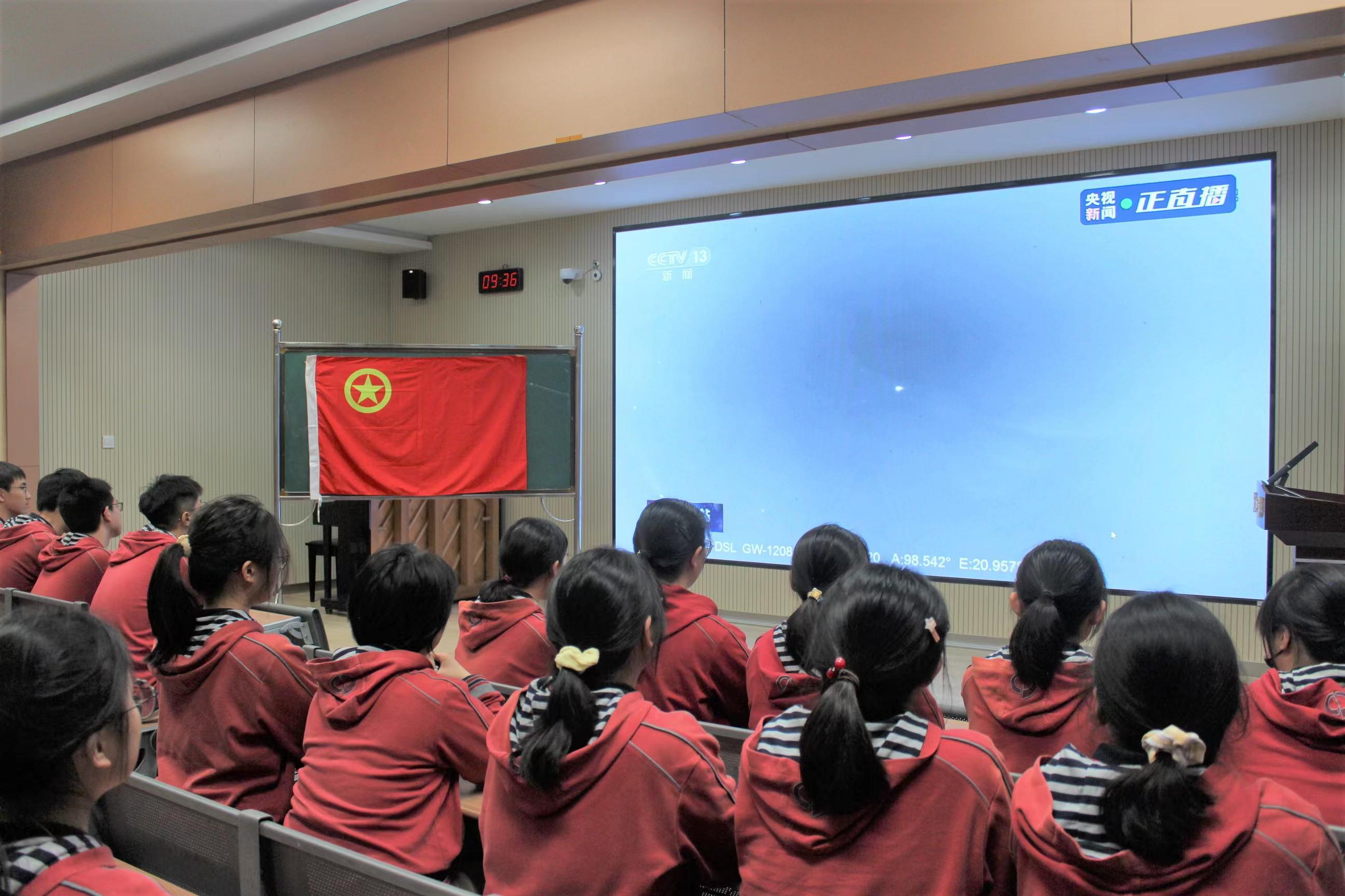 “5、4、3、2、1……”孩子们摇晃着手中的红旗,大声跟着倒数,欢呼声、倒抽气的声音一起传来。“火箭是不是很烫啊!”“起飞了起飞了!”同学们紧紧盯着画面,不时感叹。