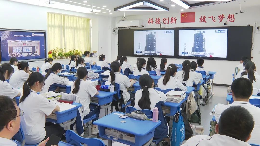上午九点,华东理工大学附属闵行科技高级中学一间教室内座无虚席,大屏幕上直播的神舟十六号载人飞船发射实况牵动着每位学生的心。由于华理科高毗邻闵行航天城,不少学生家长也是航天工作者,对于航天人无怨无悔的奉献精神,孩子们都有着最深切的感受。