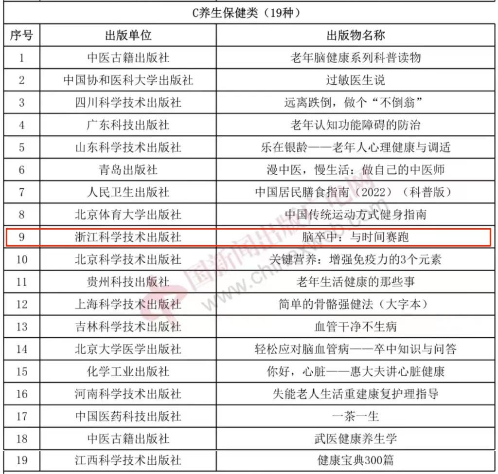 2023年5月,由瑞金康复团队精心制作的科普图书《脑卒中:与时间赛跑》入选“2022年向全国老年人推荐优秀出版物”。此次评选活动由全国老龄工作委员会办公室、中国老龄协会、中国出版协会联合开展,是引领我国银发阅读的重点活动。全国入选的出版物共有100本,《脑卒中:与时间赛跑》等19本书籍一同入选了养生保健类优秀出版物。