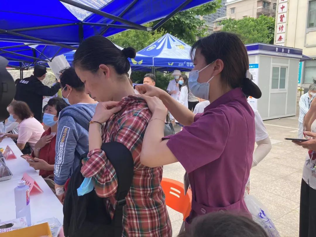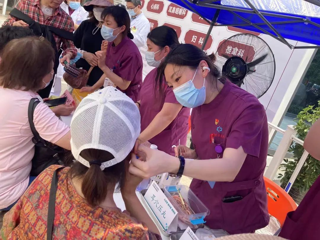 中医护理团队热情地给居民进行穴位贴敷、耳穴压豆、指压点按等服务,中医文创产品展示也吸引了众多居民的目光。