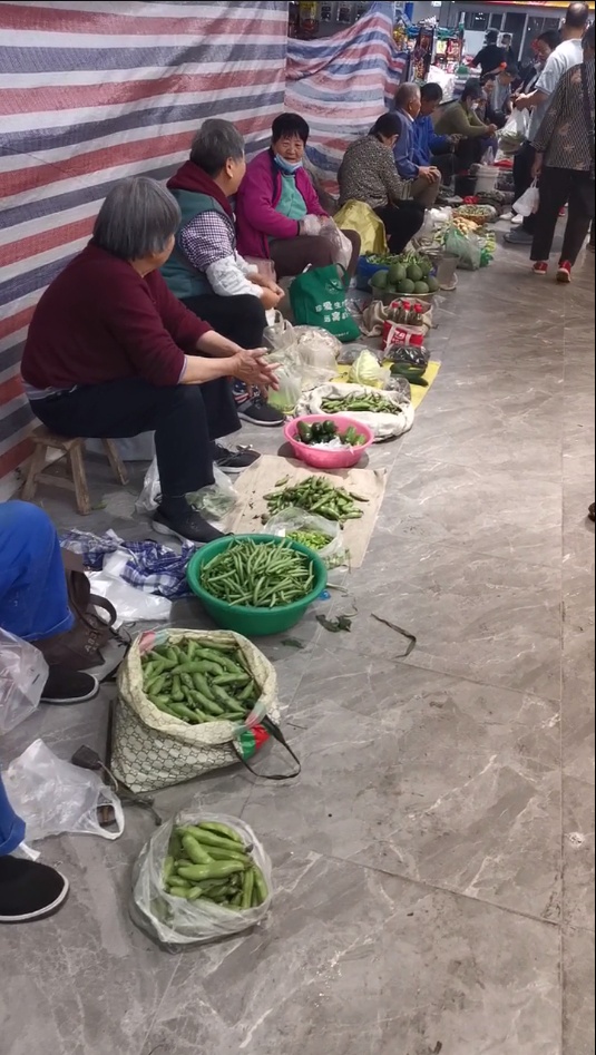 在这个限时开放的自产自销区,阿姨爷叔们各自的摊位很小,几个塑料袋、一个盘子可能就是一个摊位。卖的蔬菜,也多类同,如五月下旬,蚕豆就是绝大多数摊位的主要菜品。“家里吃不完的,拿过来卖一卖。不是每天都有的……”这是摆摊的阿姨爷叔跟小编说的最多的。
