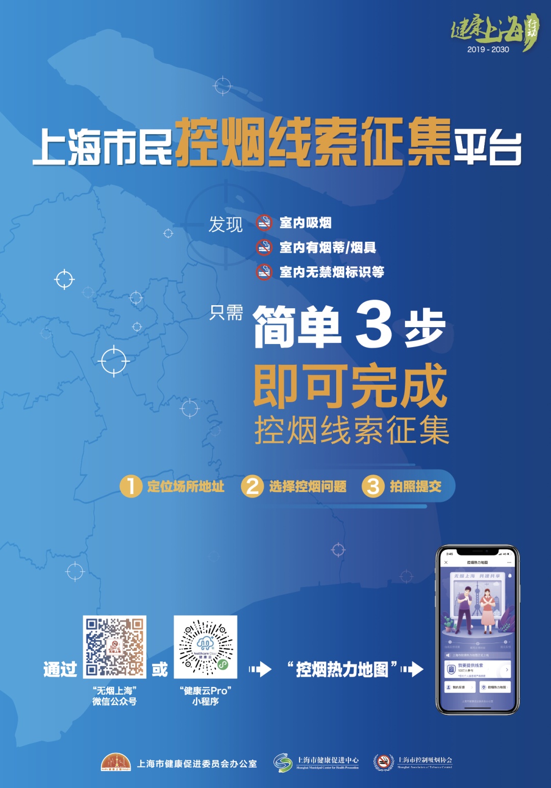 市民公众可通过“上海发布”微信公众号“市政大厅”、“无烟上海”微信公众号“功能菜单”、“健康云Pro”小程序“健康管”中的“控烟热力地图”以及12345控烟投诉举报平台,提供法定禁烟场所的控烟问题线索(如室内吸烟、室内有烟蒂烟灰烟具、室内无禁烟标识等),以加强社会监督,督促场所进行控烟管理和整改。同时,也可作为控烟监管部门执法检查和控烟志愿者巡查、宣传的重点目标,实现精准高效的控烟社会共治,共建共享无烟环境、助力健康上海建设。