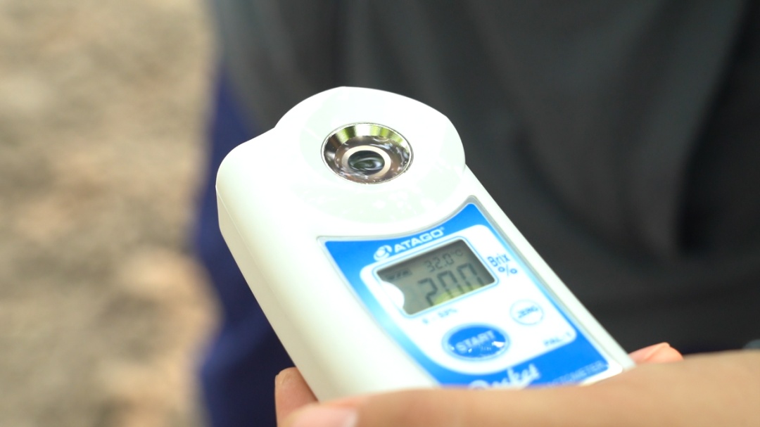 马陆葡萄主题公园相关负责人、上海马陆葡萄研究所副所长单文龙随身携带着剪刀和糖度仪,检查葡萄的生长情况和质量把关是他每天的工作。只见他随手剪下一颗日光红无核葡萄,将果蒂摘下轻轻一捏,果汁很快就填满了糖度仪的测量槽。
