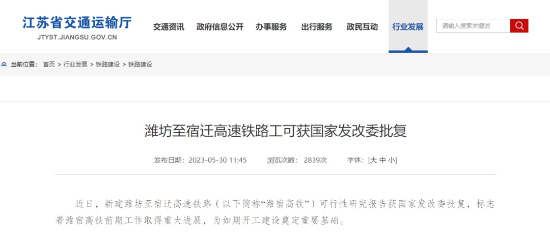 近日消息显示潍坊至宿迁高速铁路正式批复。5月30日,江苏省交通运输厅官网发布,新建潍坊至宿迁高速铁路可行性研究报告获国家发改委批复。