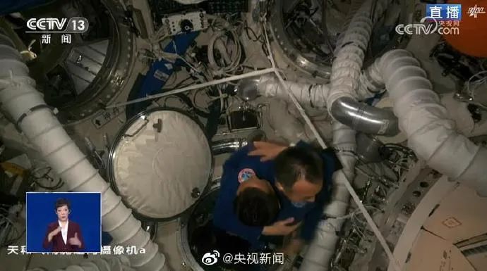 随着轨道舱前舱门打开,两个乘组的航天员彼此挥手致意。景海鹏率先进入空间站,和费俊龙拥抱前,他激动地说:“老哥好!”