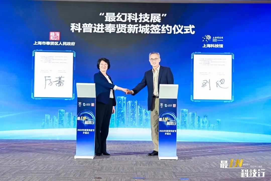 “最幻科技展”科普进奉贤新城签约仪式也在本次活动上进行,上海科技馆副馆长刘健、奉贤区副区长厉蕾分别代表上海科技馆、上海市奉贤区人民政府签约。