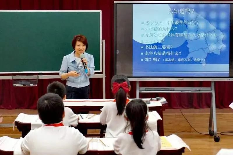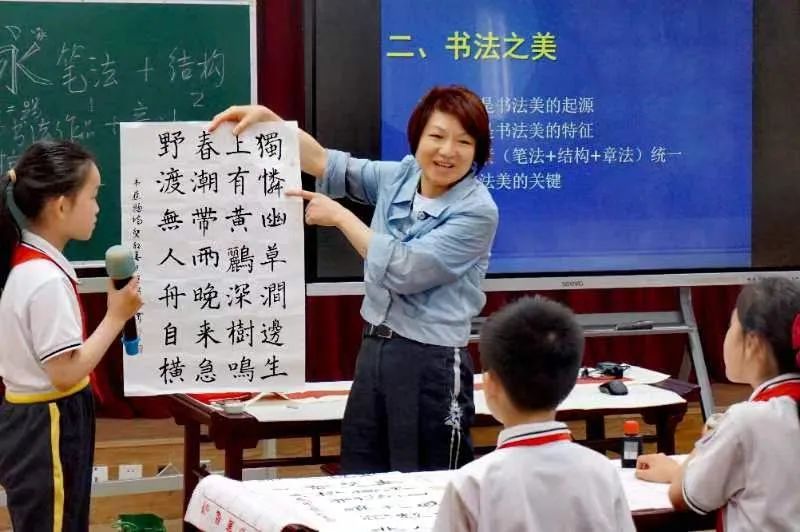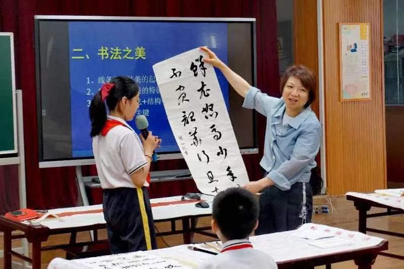活动中,徐老师围绕“书法之源、书法之美、书法之趣”三个方面展开了生动教学。首先,她利用图文讲述文字演变的历史过程,介绍书法的起源;紧接着,徐老师深入浅出地讲解了笔画技法、结构规律和章法,耐心细致地引导学生们了解:要学好书法,笔画是基本功。“原来,平时临摹的碑和帖是不同的。”学生们围绕着徐老师,听得饶有兴致,津津有味。