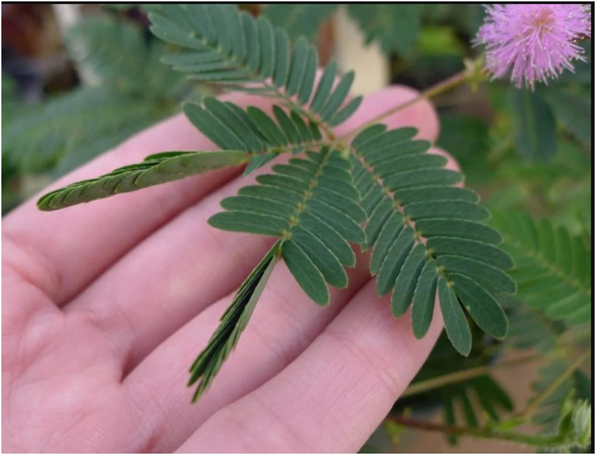 含羞草害羞的秘密藏在它的叶柄和小叶柄基部处,这些地方都有一个略膨大的囊状结构,叫做叶枕。平时,叶枕里面充满了水分和细胞液,支撑着叶片保持展开状态。但是当受到外力刺激时(包括触摸、震动、温度变化等),叶枕里面的水分和细胞液会迅速流向别处,导致叶枕缩小,使得叶片失去支撑而合拢起来。这种现象被称为感震运动,是一种植物对外界刺激的快速反应。