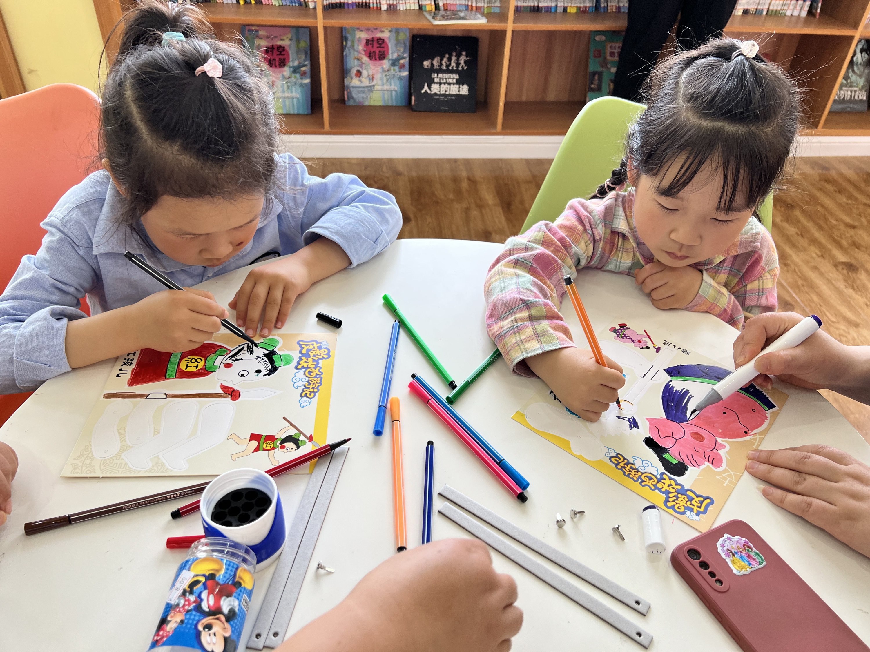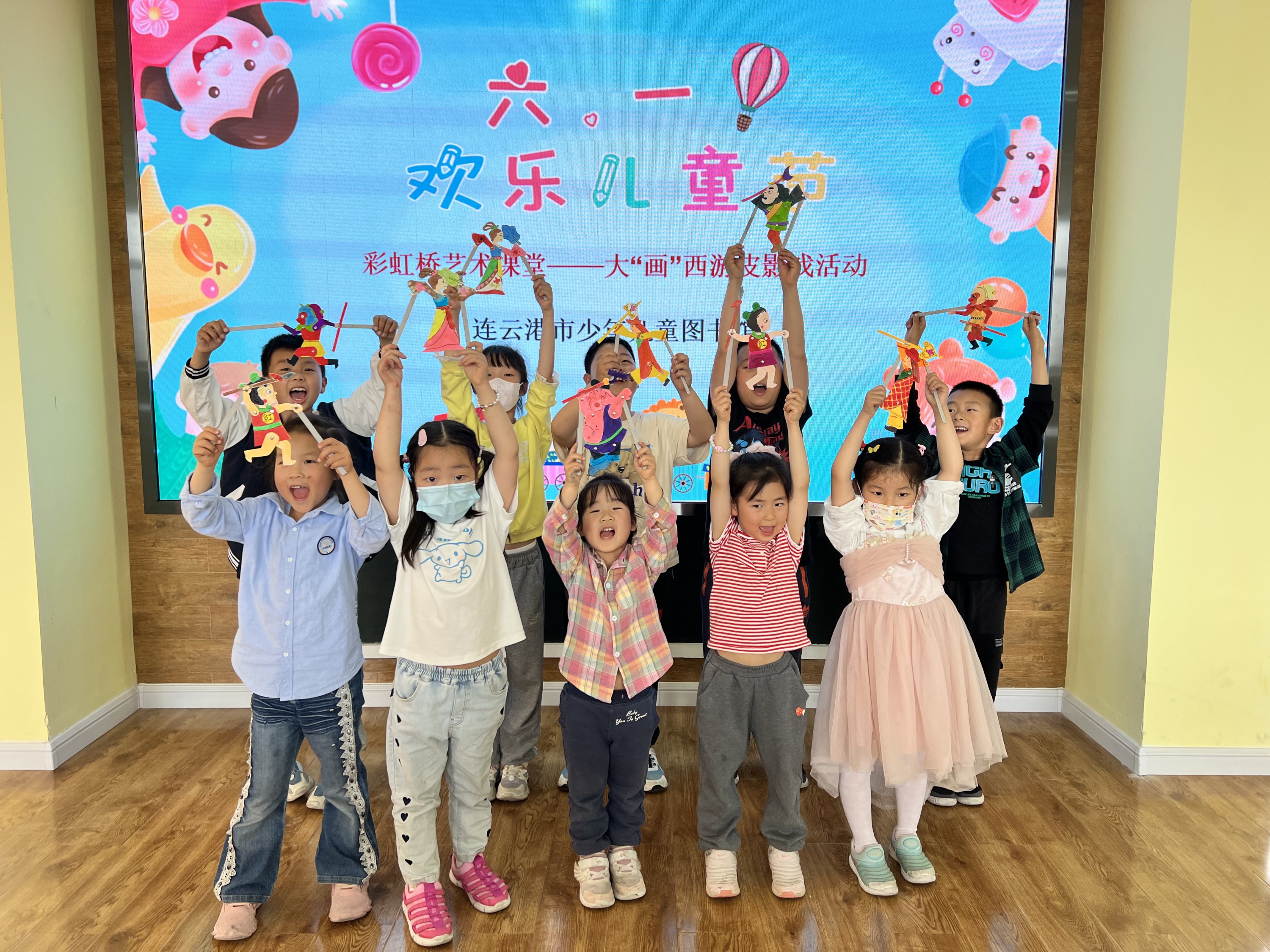 连云港市少儿图书馆教孩子们“DIY皮影戏”,活动现场,孩子们聚精会神地紧盯幕布,伴随着童趣的音乐,孙悟空、猪八戒、沙和尚、白骨精等影偶,在皮影匠人的巧手下腾挪翻转,情节紧凑的故事、生动的影偶形象,通过皮影戏的形式演绎的《西游记》趣味横生。在DIY皮影的环节,上色、拼装,不一会儿,一个个活灵活现的角色在孩子们的手中诞生,他们把木棒高高举起,摆动着,欢呼着。