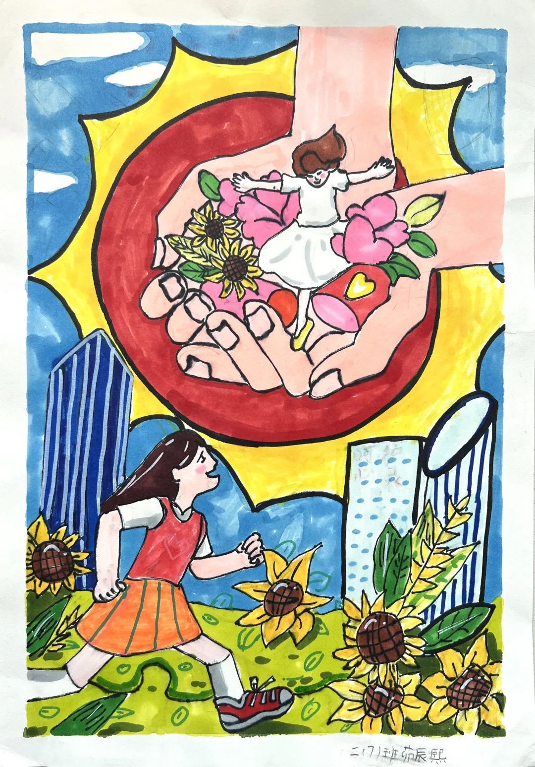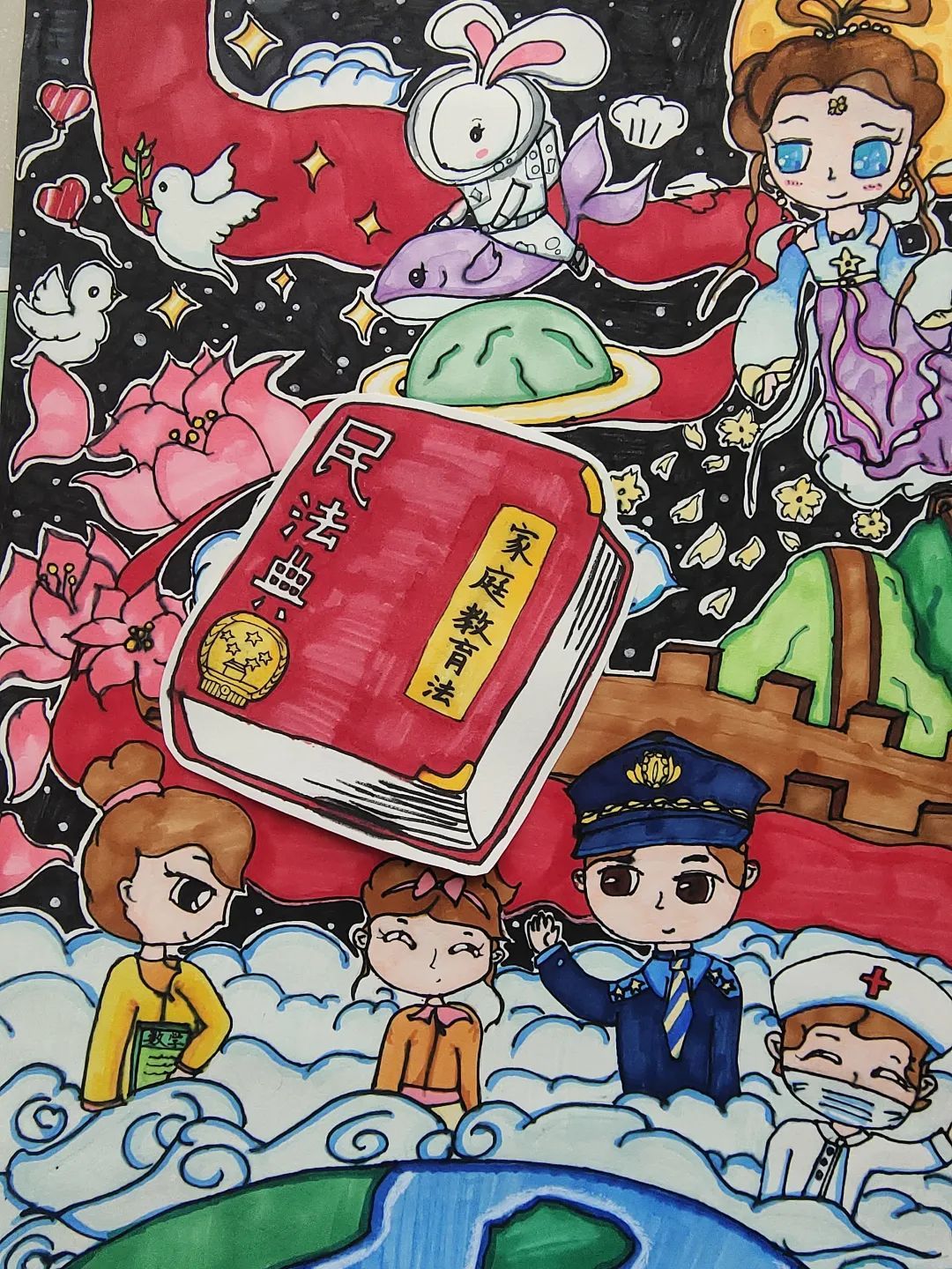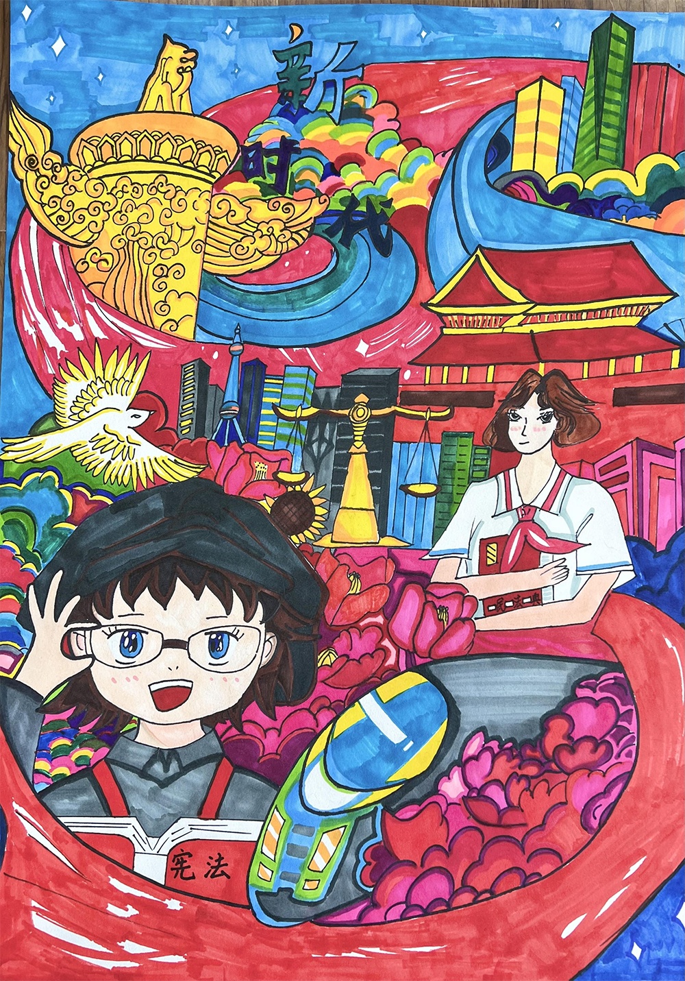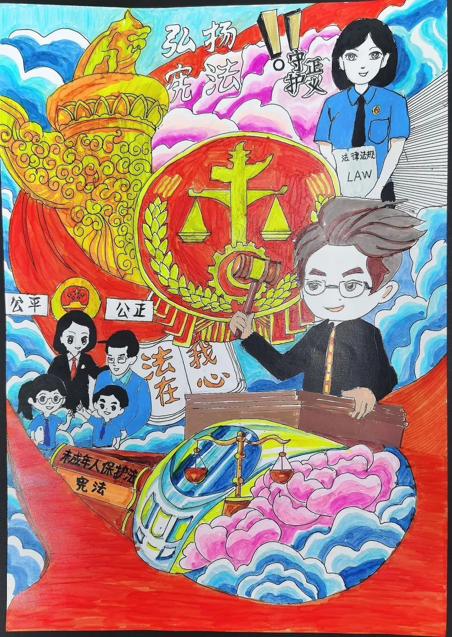 我的画上,庄严的法徽用华表托举,环绕着维护法治、守护正义的辛勤的法官、检察官们,以及被他们保护着对小朋友们。最后,飞驰的高铁象征着对未成年人保护法的进程落实得快速又稳当。