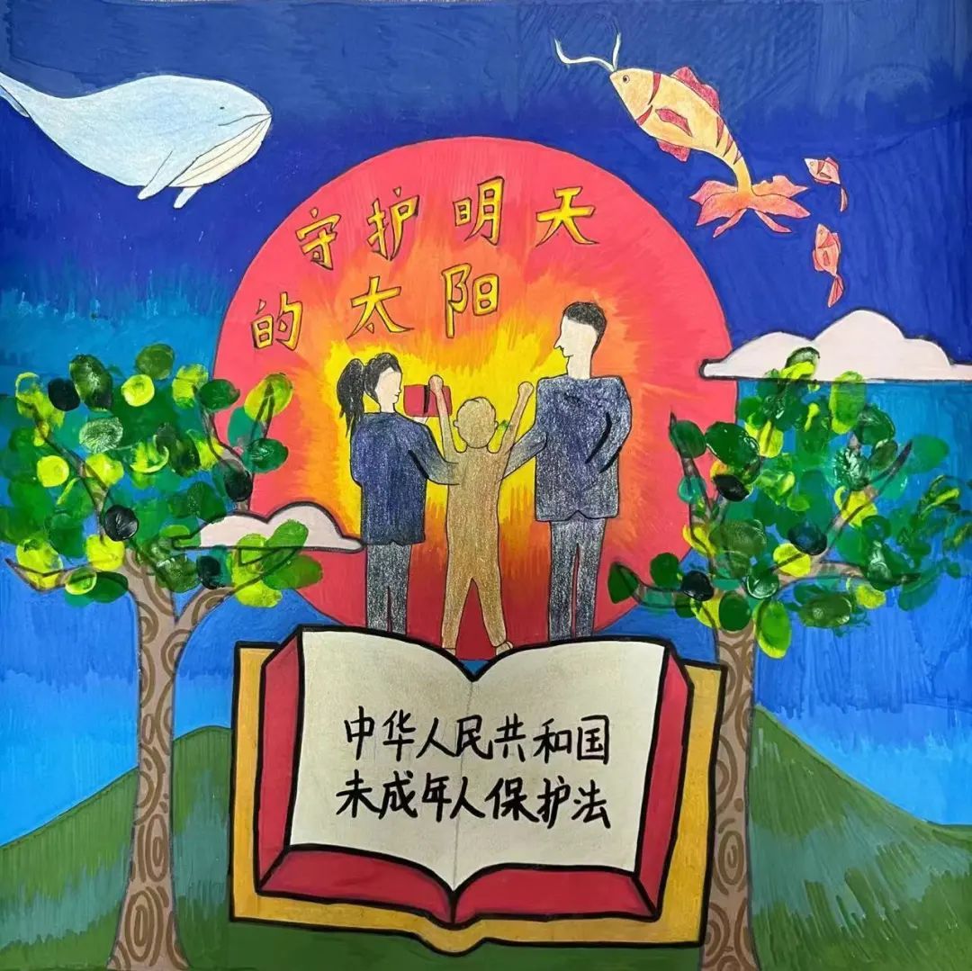 一本未成年人保护法托起海天交汇处一轮初升的太阳。在两位未检检察官的中央,是一个手拿未成年人保护法的小朋友,一代代未成年人在一代代未检人的守护下茁壮成长。两棵小树的树叶,都是小朋友们按下的小手印,代表着希望与承诺。蓝鲸和锦鲤腾空越起,象征着“携长风予你翱翔,我们始终在场”!