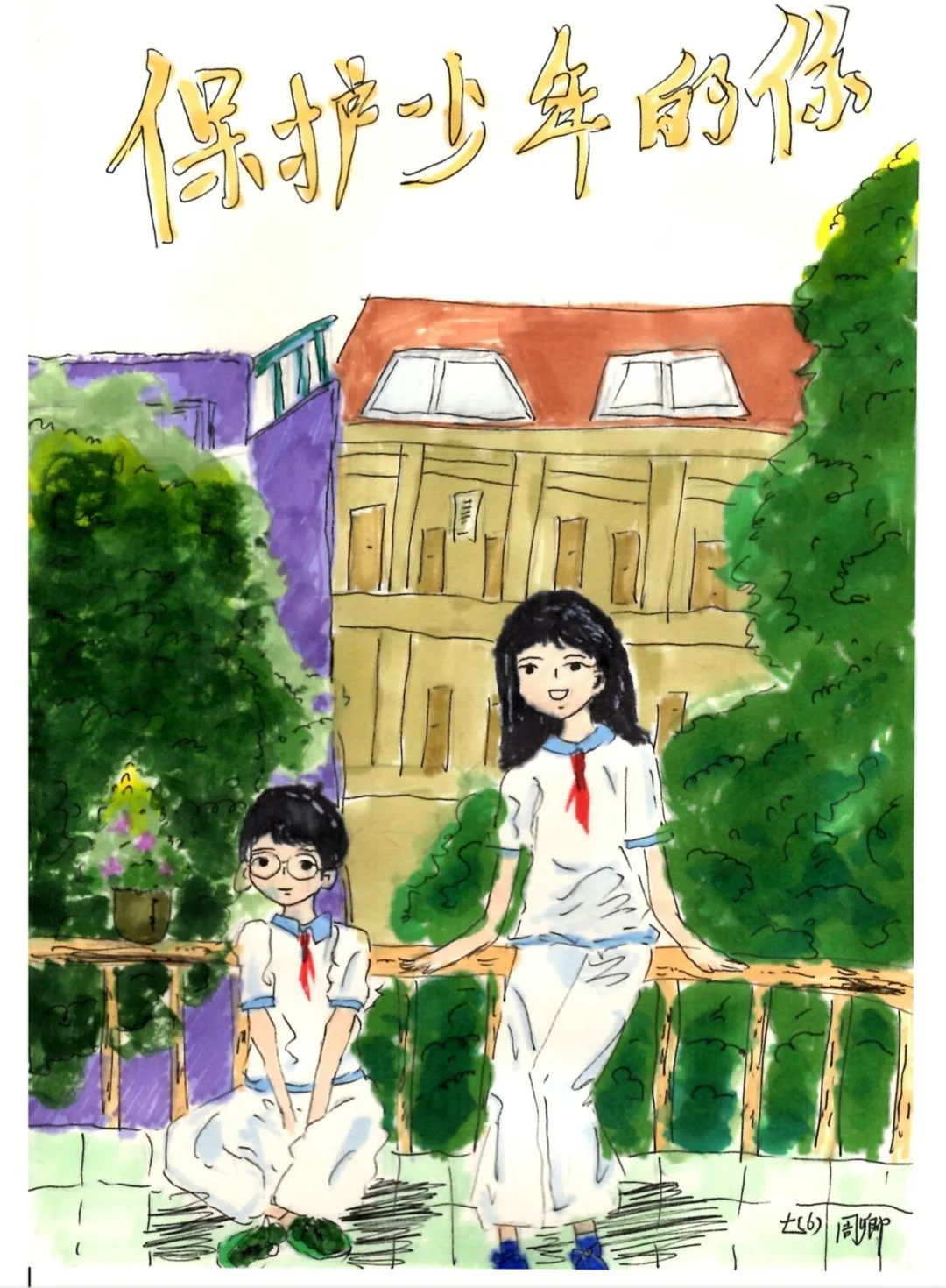 提到少年二字,我就想到了校园及学生,用了大面积绿色,背景为教学楼生动地画出了学生在校的生活,体现了积极向上的时代风貌。