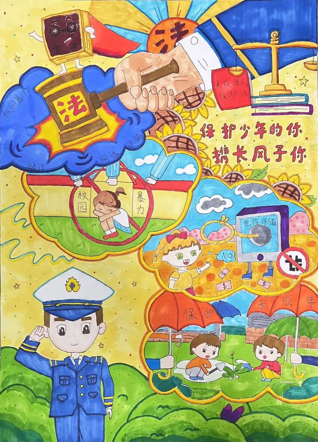 用法治的力量,为茁壮成长的祖国花朵撑起安全、晴朗的天空,为祖国的未来撑起一片蓝天,呵护他们健康成长!