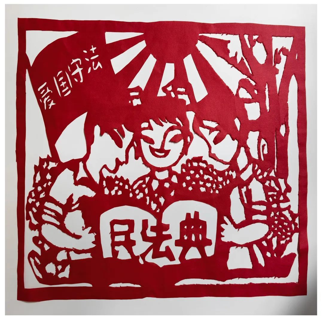 用剪纸的手法表现了我们学生要爱国守法。