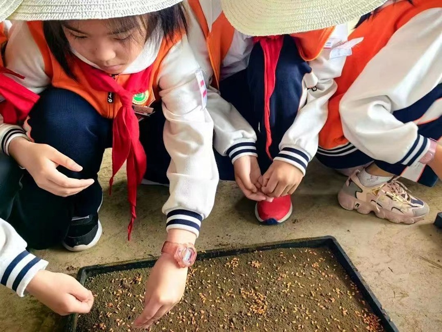 育秧智慧:学校“小农夫们”认真听着农耕老师的讲解,了解秧盘育种过程,亲手撒下谷子育秧,培育下希望的种子,用心感悟劳动的真谛,小小的育种环节,拥有着大大的智慧。