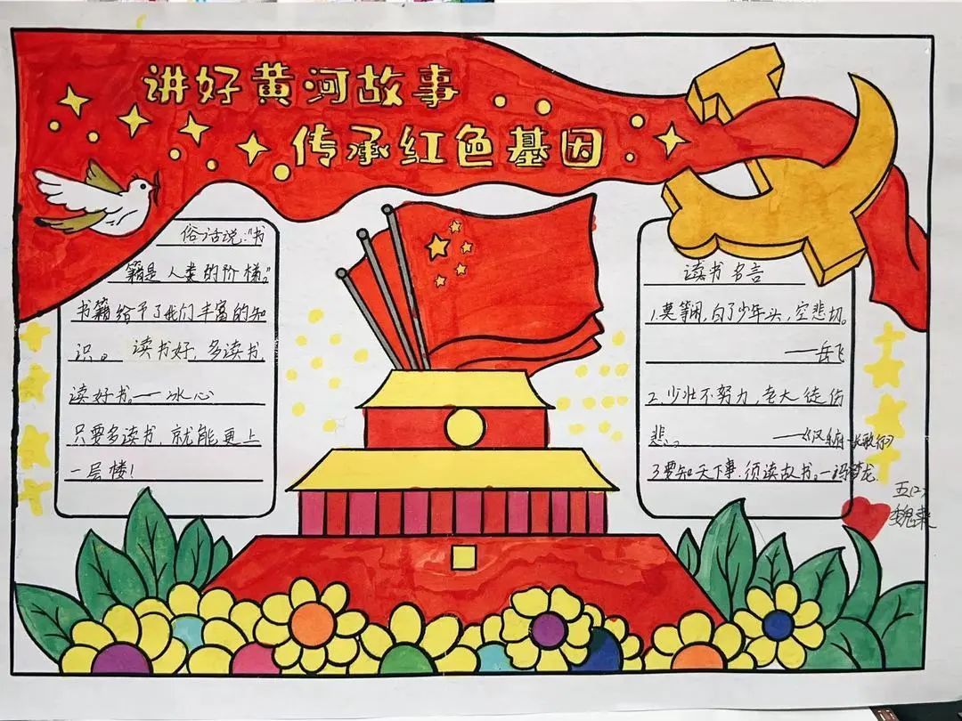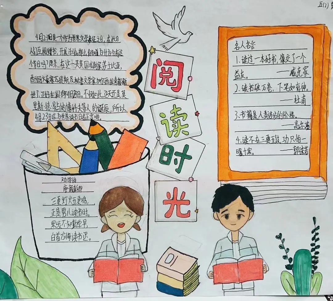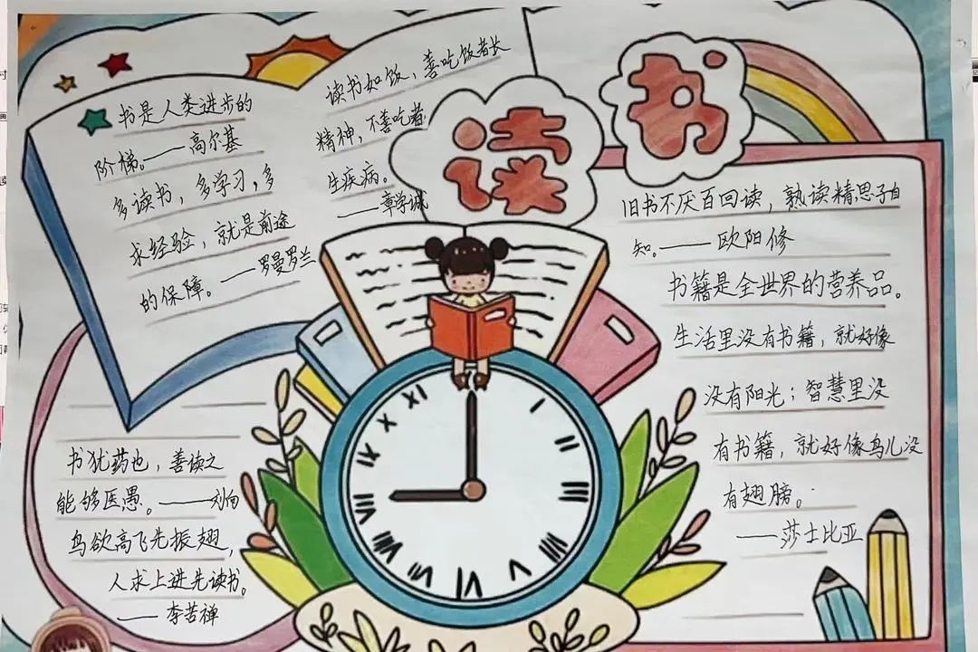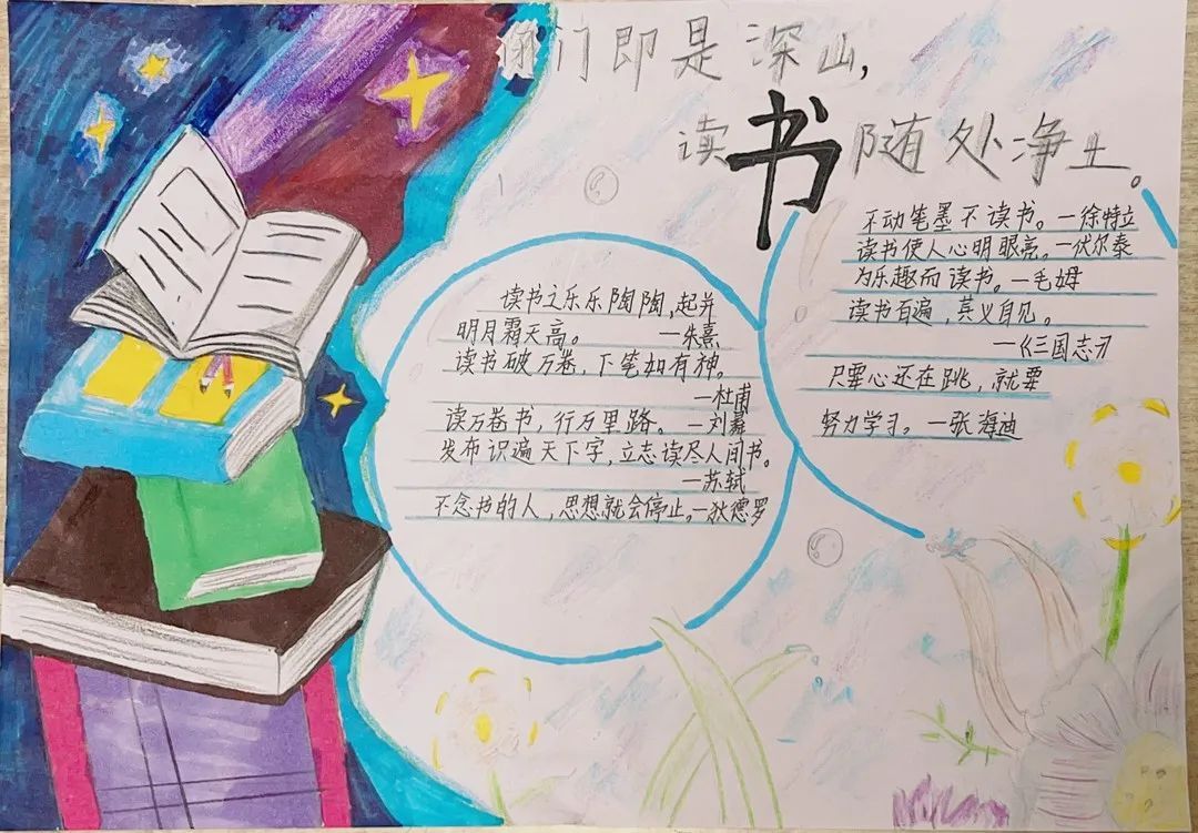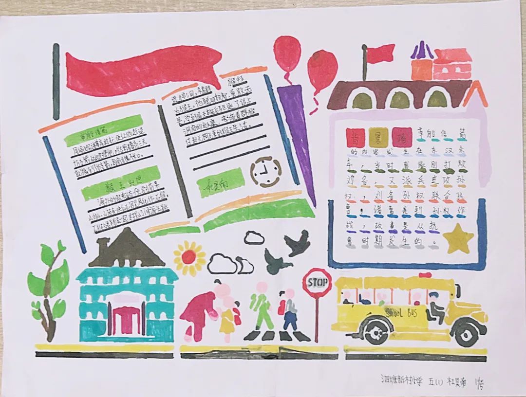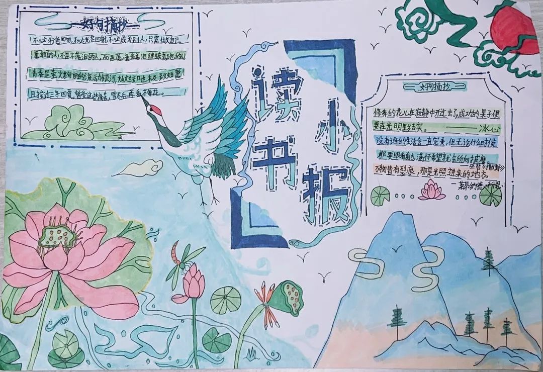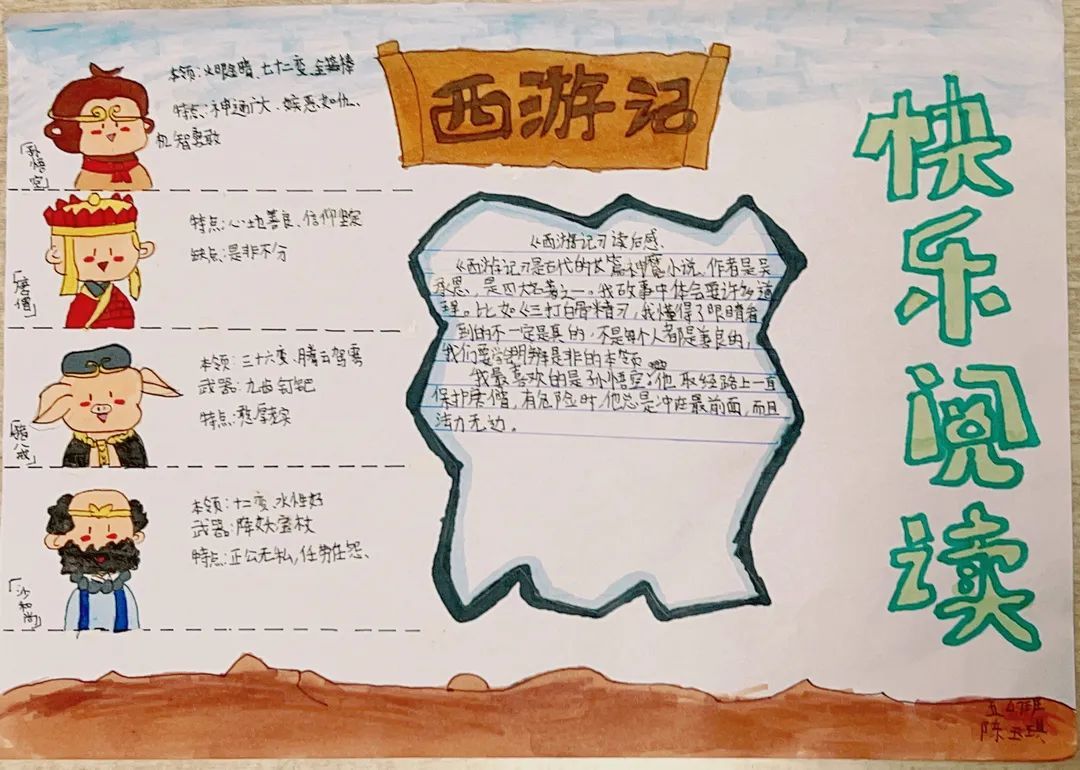中高年级小朋友的小任务是完成一幅读书小报或写一篇读后感。同学们都积极参与,一幅幅别具匠心的作品蜂拥而来。《小王子》《西游记》《红楼梦》……这些经典故事都被孩子们搬到小报上。蜘蛛夏洛、骑鹅旅行的尼尔斯、勇敢的鲁滨逊、为人民服务的雷锋……一个个生动的人物形象跃然纸上。孩子们从他们身上学到了勇敢和坚持,读懂了友谊的珍贵。
