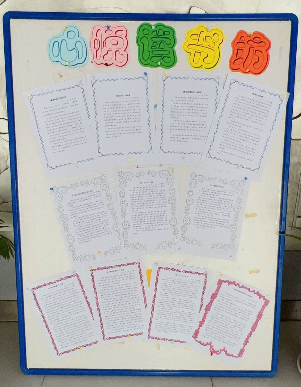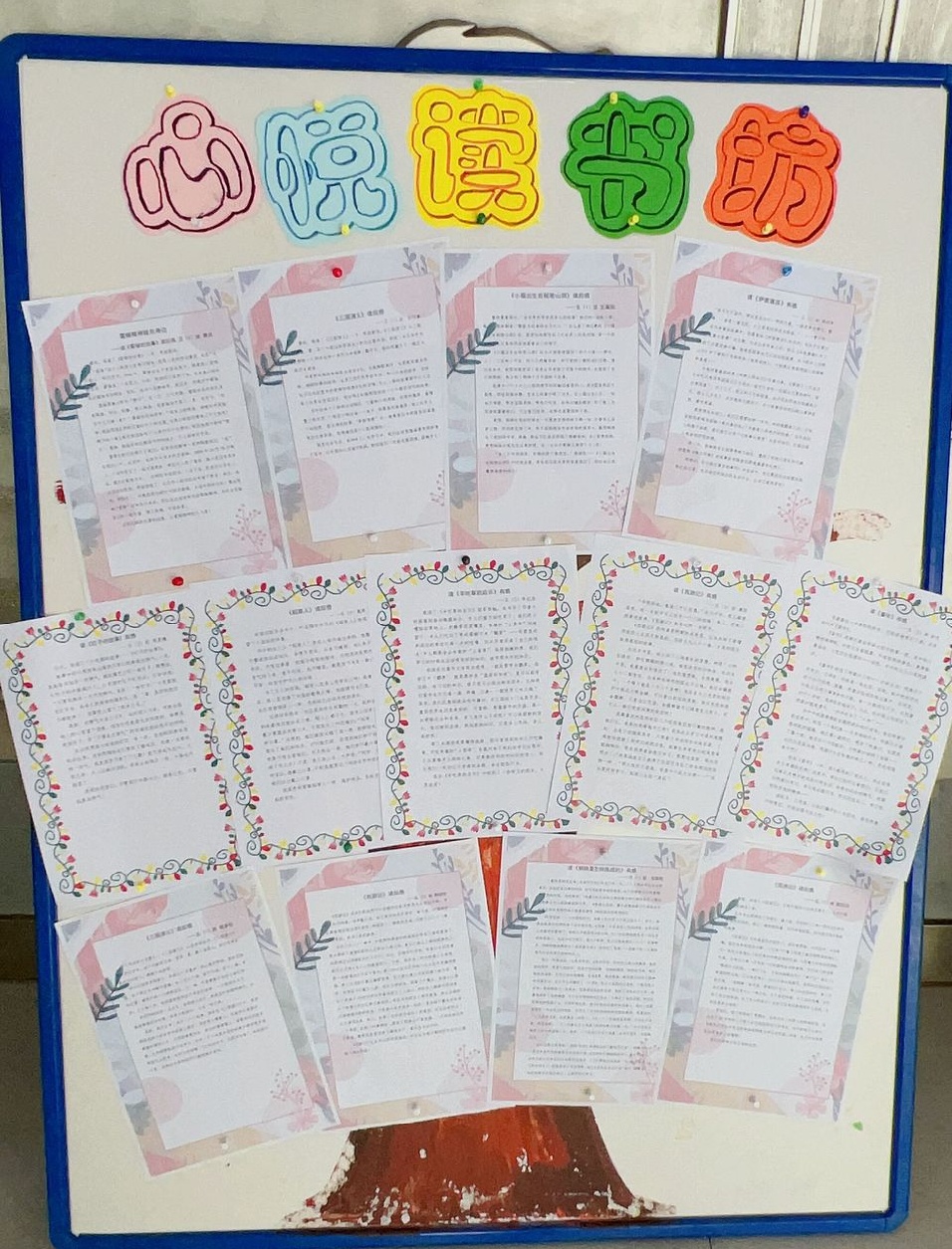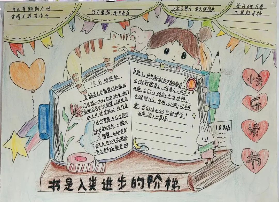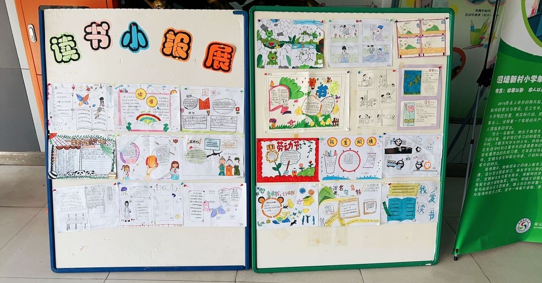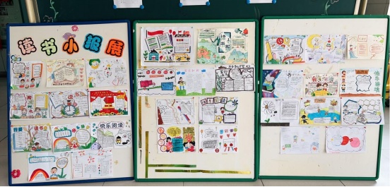 老师还把所有的作品都贴出来,在校园里开展了读书小报展、读书绘画展、“心悦读书坊”展示活动。小朋友们看到自己的作品被展出了,都特别开心。课间休息的时候,他们都会两个一双、三五一堆,边看边议论。