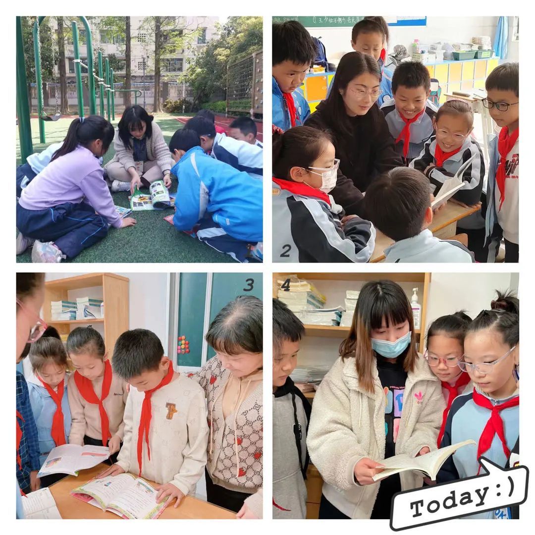 在学校,学生们和老师共读一本书,一起享受读书带来的快乐与幸福。他们有的来到操场边,在绿绿的草坪上席地而坐,围在老师身边,边看绘本,边听老师读故事;有的来到小花园,伴着潺潺的流水声,听着老师讲有趣的故事;有的在校园的图书角边,两个人边翻边读;还有的在教室的讲台前、座位上,跟老师一起读。这是一幅幅温馨的画面,更是一片片浓浓的师生情。