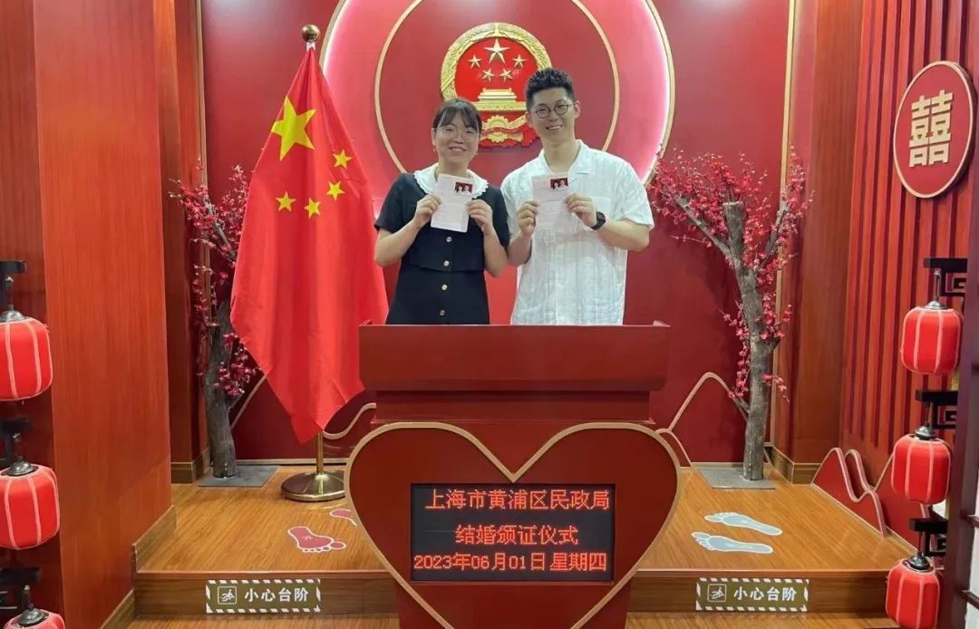 我们一个来自江西,一个来自黑龙江,现在都在上海生活工作,领证不用再请假回老家免去舟车劳顿,能够这么高效、便捷地就领到红本本,太惊喜啦!