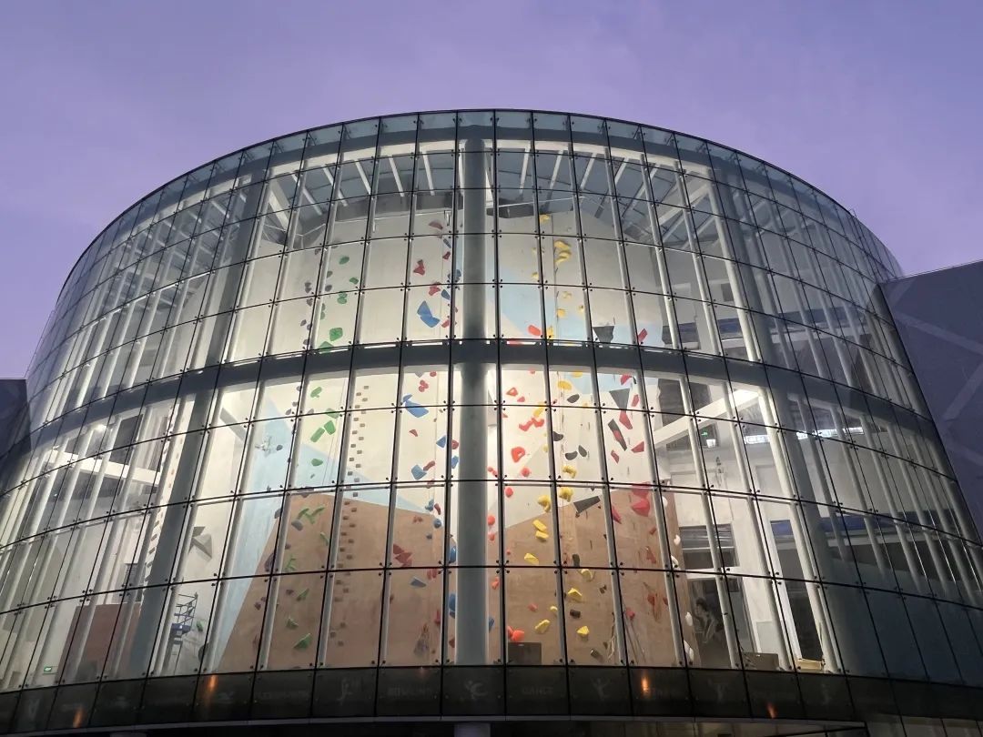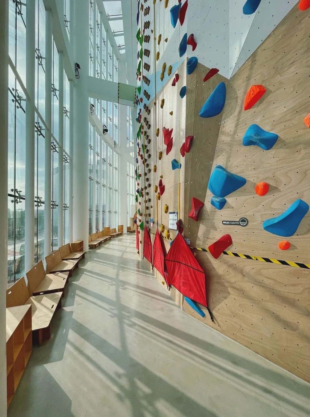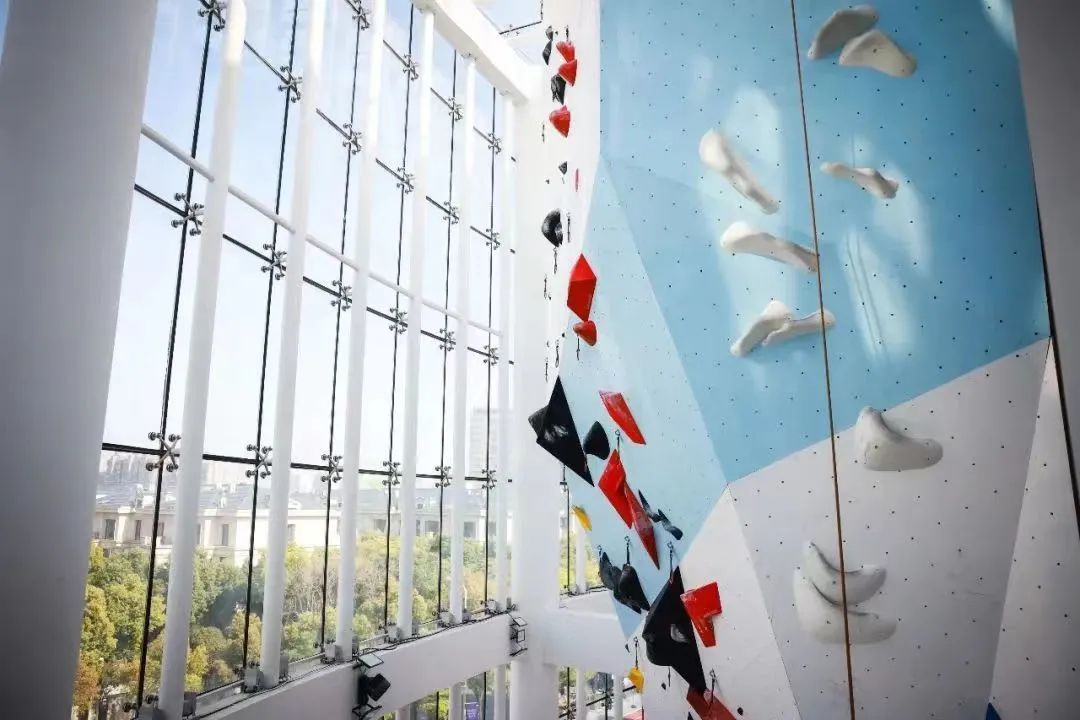 要说攀岩馆最引人注目的,当属它全观景的落地窗,即使站在场馆外部,也可看到岩壁上攀爬的身影,向上攀爬的爱好者们成为了风景的一部分。攀岩馆里视线明朗、采光良好,当攀到顶峰透过玻璃窗向外看去,别有一番成就感。