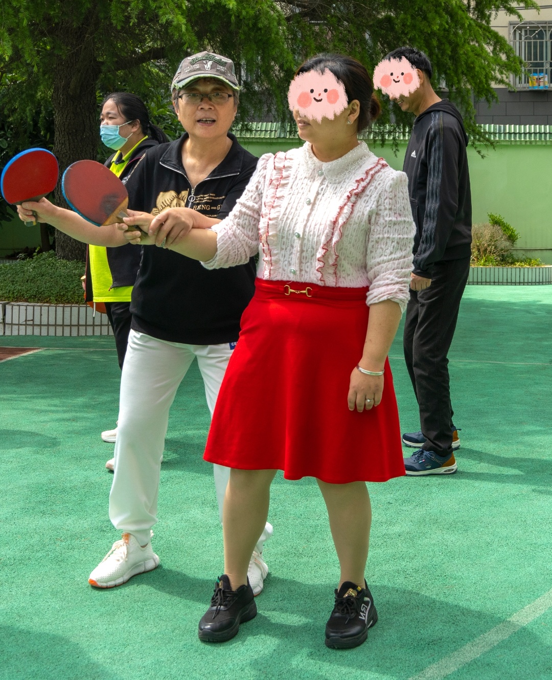 从室内讲授,到室外练习,再到乒乓台上“实战”,一堂简单的乒乓球课,却收到出奇的效果。在志愿者们地循循善诱下,当天活动的参与人数比以往都要多,连一向有孤独倾向的吴羌(化名)和王惠惠(化名)等几位重度精神障碍的学员,也玩得津津有味。两位摄影爱好者臧林法和蔡丽莲,更是耐心反复地将每位学员的学球神态姿势拍了下来。