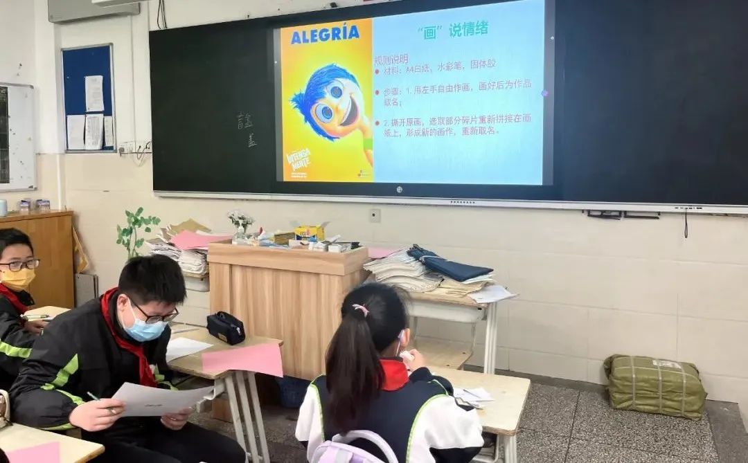 大场中学通过“画说情绪”心理健康课程,帮助孩子们认知情绪与管理情绪,学会用画笔表达自己的消极情绪,完成后将“坏情绪”原地撕碎,将部分或全部碎片重新拼接成新的画作。大家在不知不觉中释放了不良情绪,让情绪明媚起来。