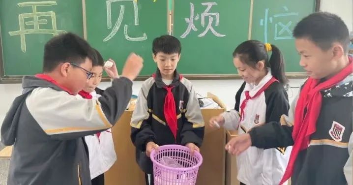 锦秋学校的学生们在“负面情绪回收站”活动中,将自己近期的烦恼写在纸条上并丢进“烦恼垃圾桶”,大家一起释放负面情绪,给心灵放个假。