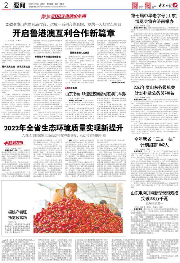 6月2日,2023港澳山东周在澳门圆满收官。本次活动是2018年香港山东周之后,时隔5年山东与港澳再度牵手,全新升级打造的重大对外开放活动。活动期间,鲁港澳达成一系列合作意向,签约一大批重点项目,开启鲁港澳互利合作新篇章。