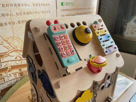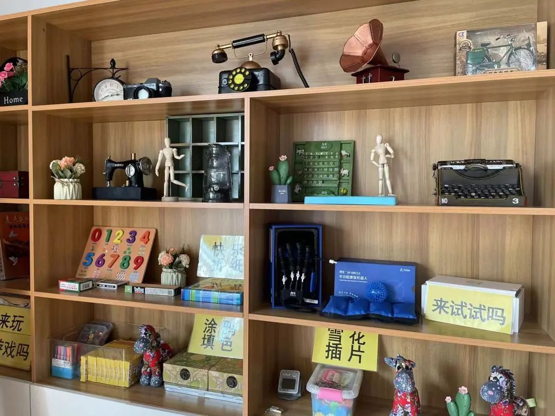 老式拨号电话机、缝纫机、唱片机……在怀旧板块,记者看到,橱柜里陈列着不少上世纪八九十年代的老物件。“我们通过让服务对象讲述和老物件之间的故事,带他们回忆当初的场景,唤醒他们内心深处的记忆。”工作人员介绍,认知症老人容易忘记即识的事物,却对过去的事情记忆深刻,因此,通过极具年代感的布置,营造一个熟悉的环境,勾起老年人对旧时的回忆,这对认知症的早期干预与康复有一定的效果。