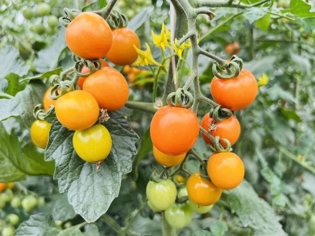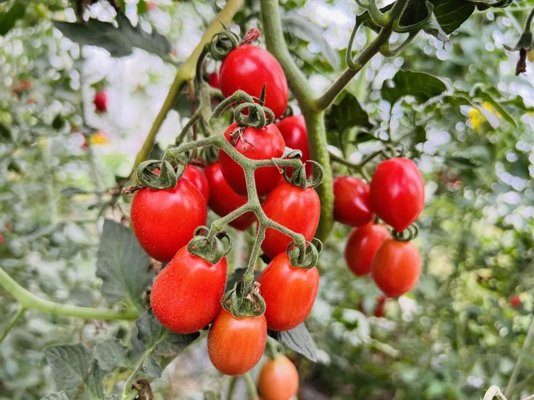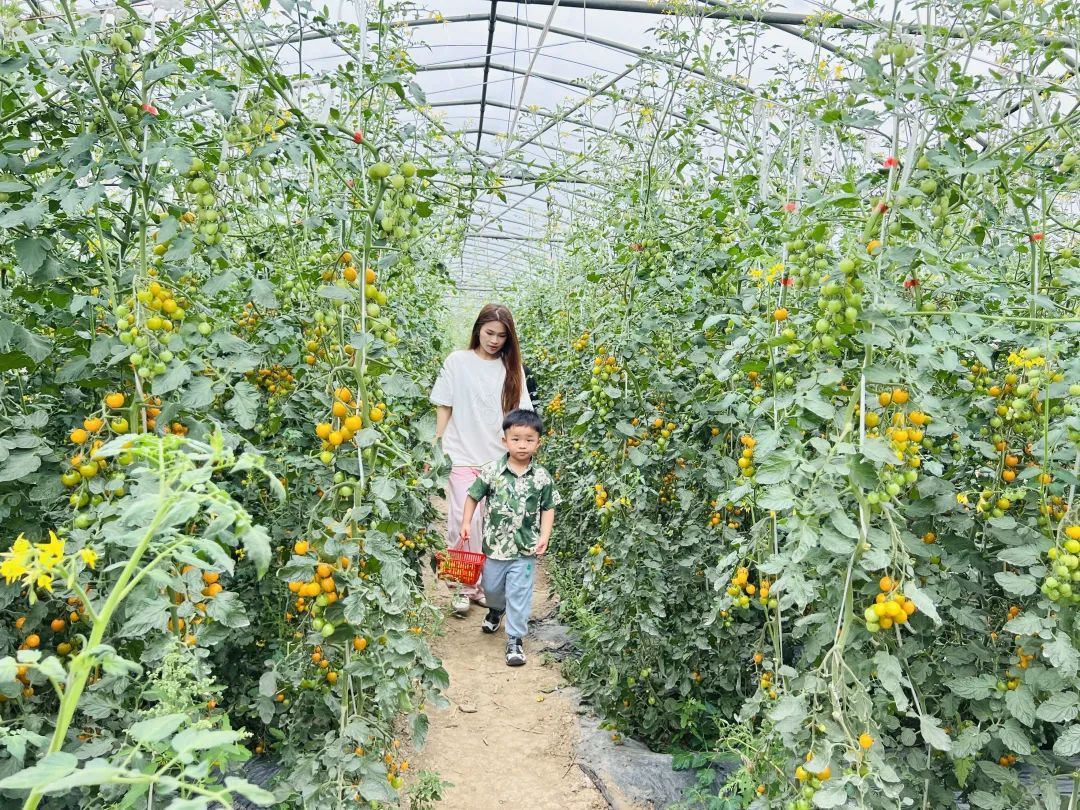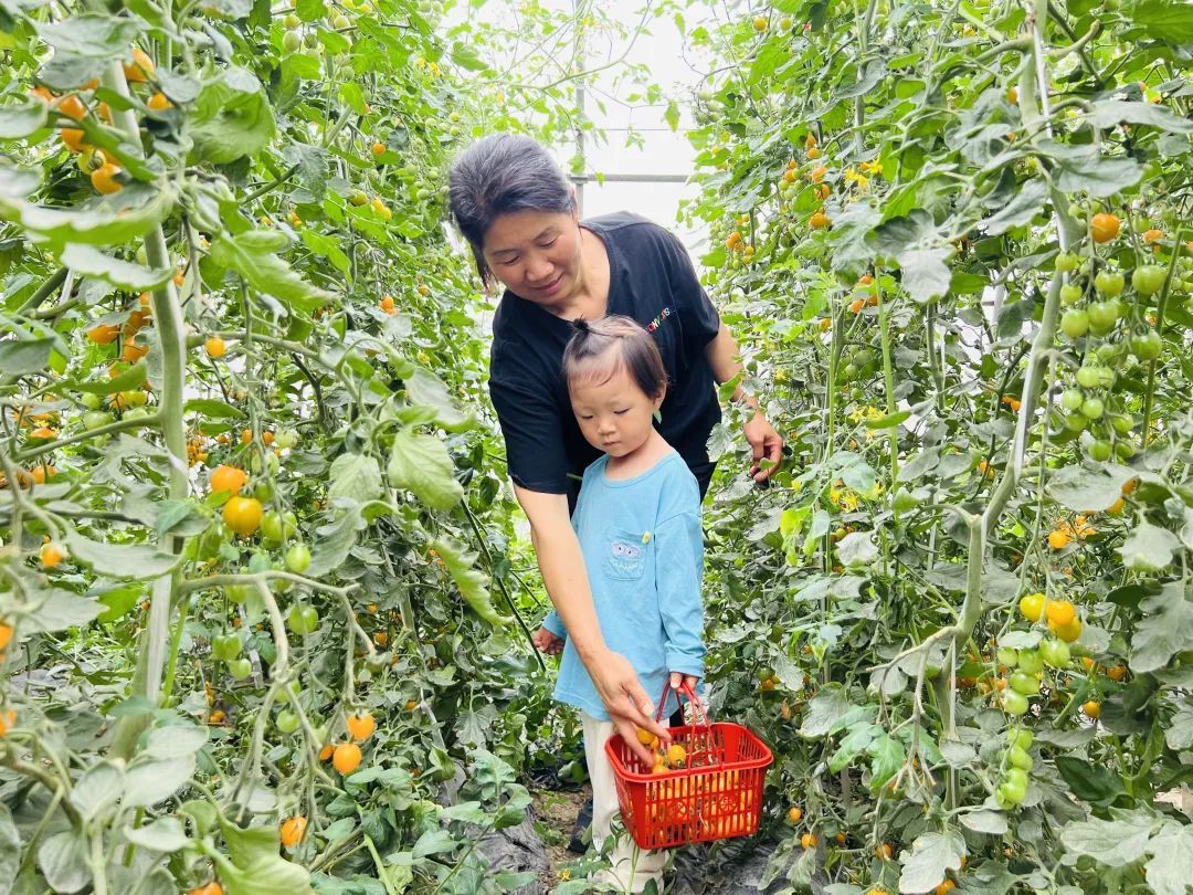 走进天平村农业合作社,大棚里一人多高的番茄植株密密排列,碧绿的藤蔓上挂着一串串五颜六色的水果番茄。在郁郁葱葱的枝叶掩映下,家长带着孩子提着小篮筐穿梭其间,摘下一颗颗圆润饱满的番茄,品尝初夏的酸甜滋味。
