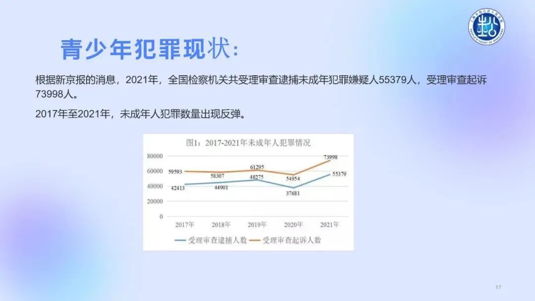 “这个问题问得好。” 陈镪以数据、图表为大家展示了近年来全国范围内未成年人犯罪,及涉黑恶犯罪现状。