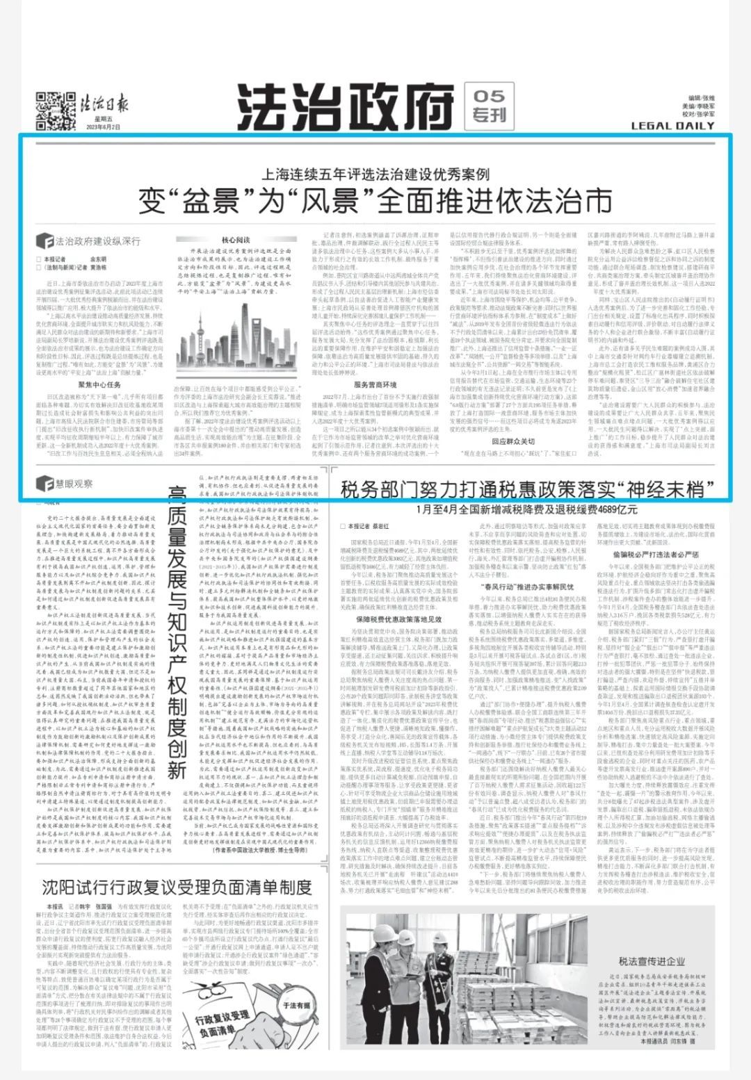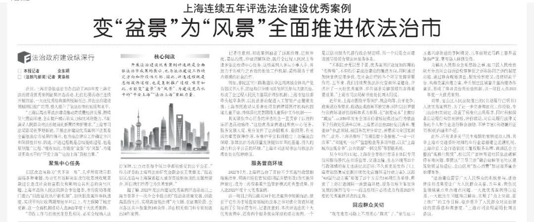从今年3月1日起,上海在全市推行市场主体以专用信用报告替代在市场监管、交通运输、生态环境等23个行政领域的有无违法记录证明;不久前更是发布了《上海市加强集成创新持续优化营商环境行动方案》,这部“6.0版行动方案”部署了27个方面共195项任务举措,释放了上海打造国际一流营商环境、服务市场主体加快发展的强烈信号……而这些项目必将成为角逐2023年度的优秀案例评选的主角。